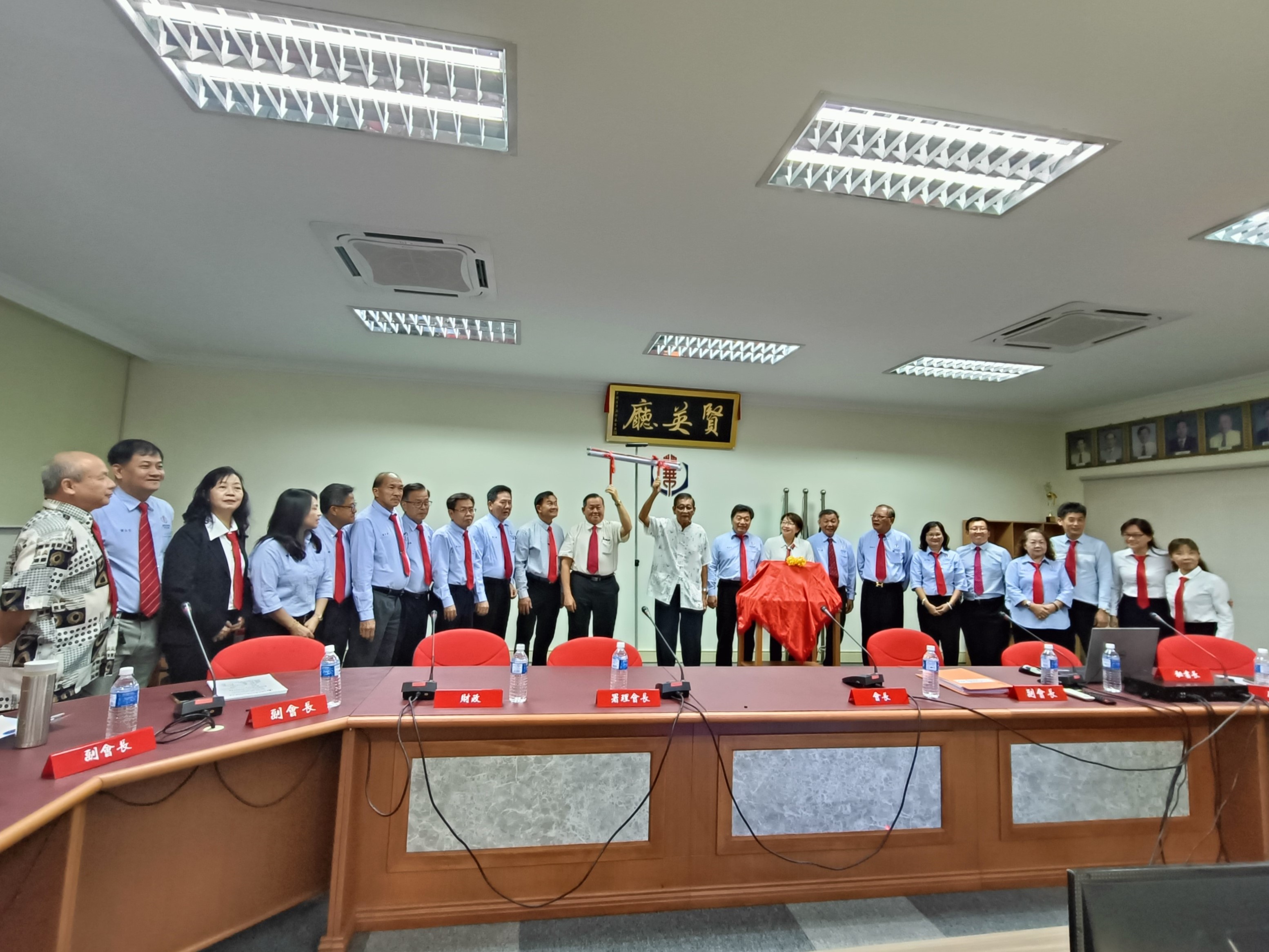 会长刘仁祥赠送《华团手冊》予甲必丹刘久生。