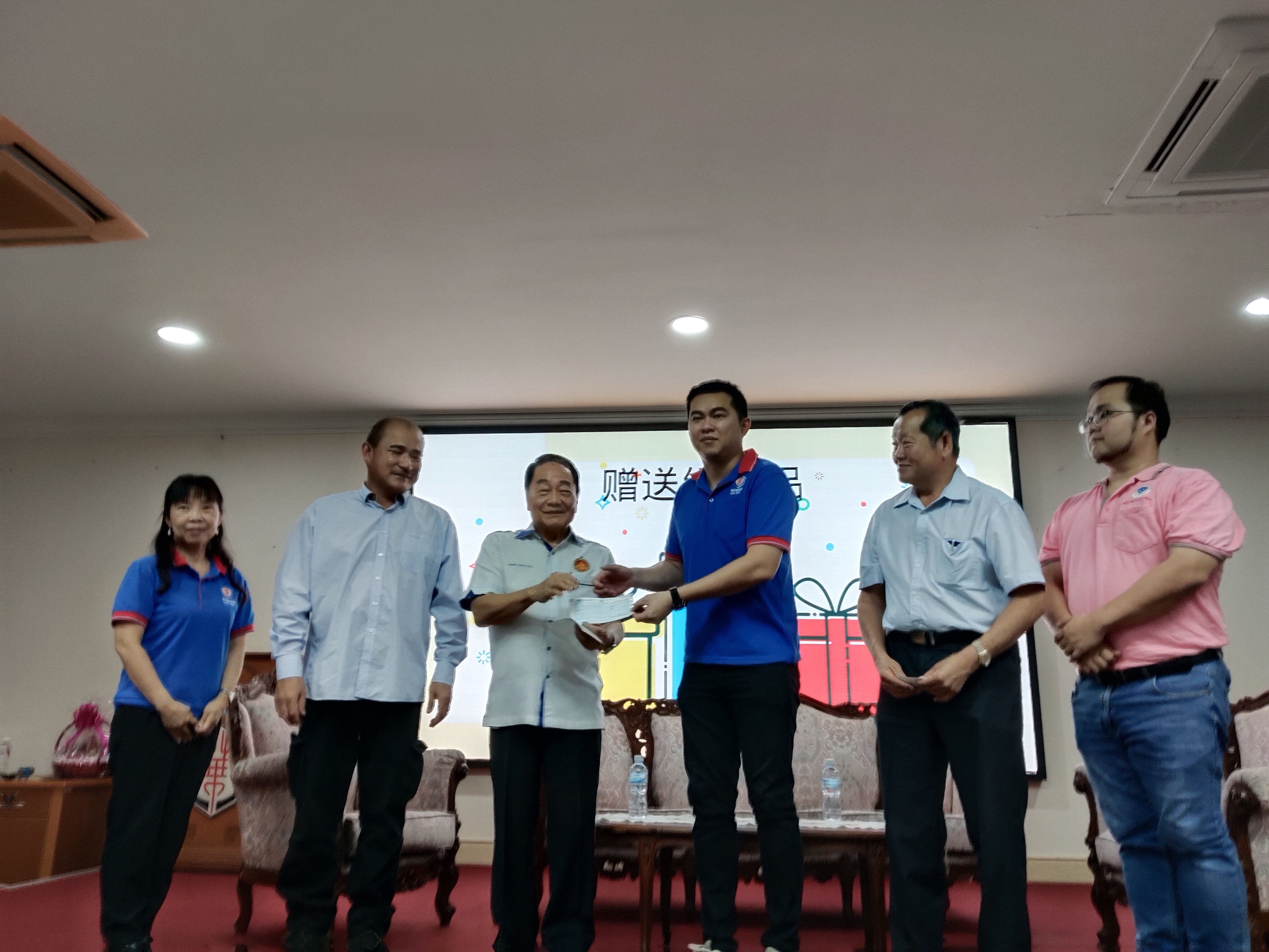 (左3)峇旺阿山区议员兼诗巫省华团名誉顾问拿督斯里黄顺舸移交支票予华青团团长许为建(右3)