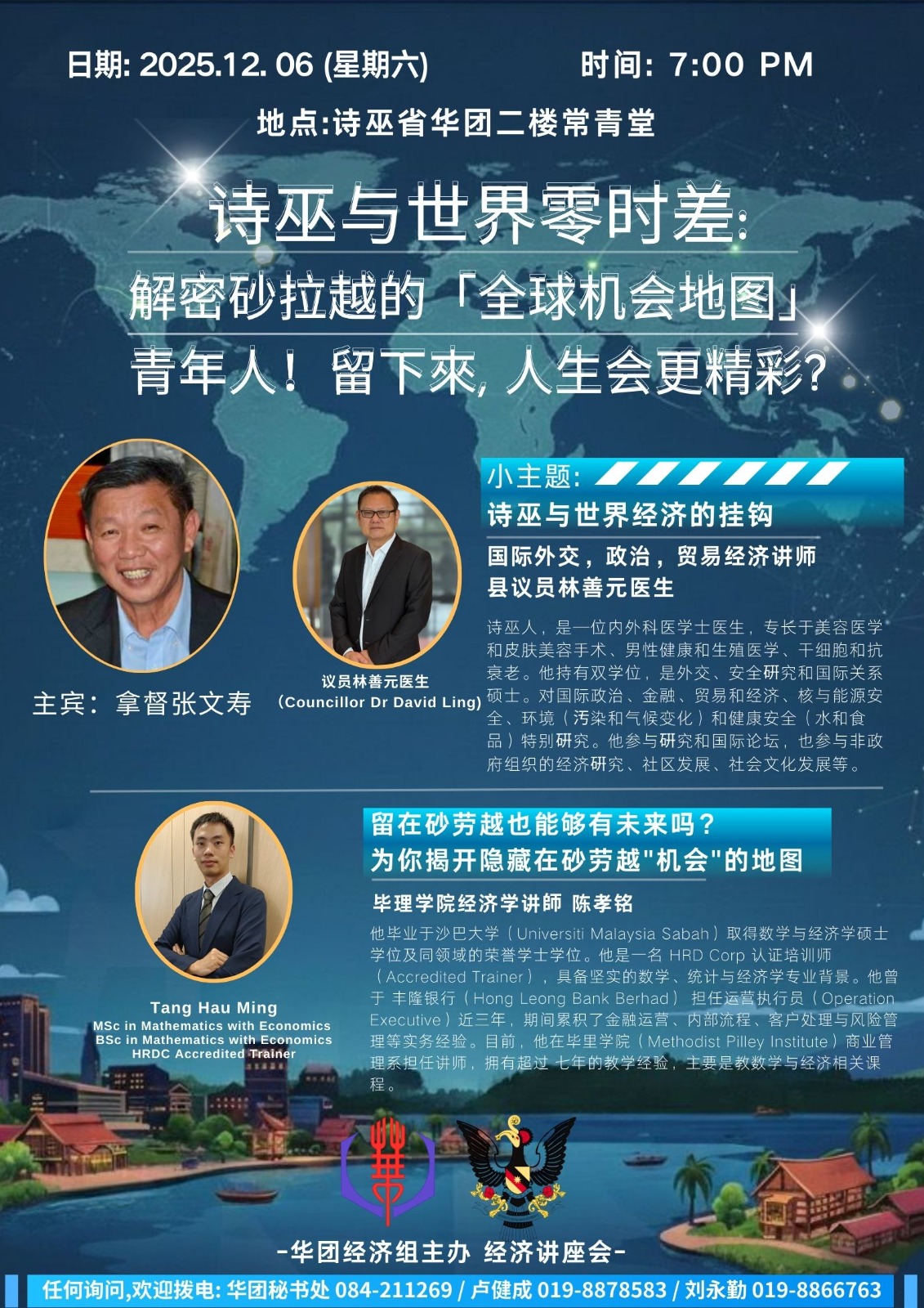 为凝聚青年力量、激励更多人扎根本士共创繁荣,打破“离乡才能求发展”的固有认知,诗巫省华团经济组将於12月6日(星期六)晚上7时,在诗巫省华团二楼常青堂举办主题讲座“诗巫与世界零时差:解密砂拉越的‘全球机会地图’”。届时将邀请拿督张文寿担任讲座会主宾,讲师为县议员林善元医生及毕理学院经济讲师陈孝铭。