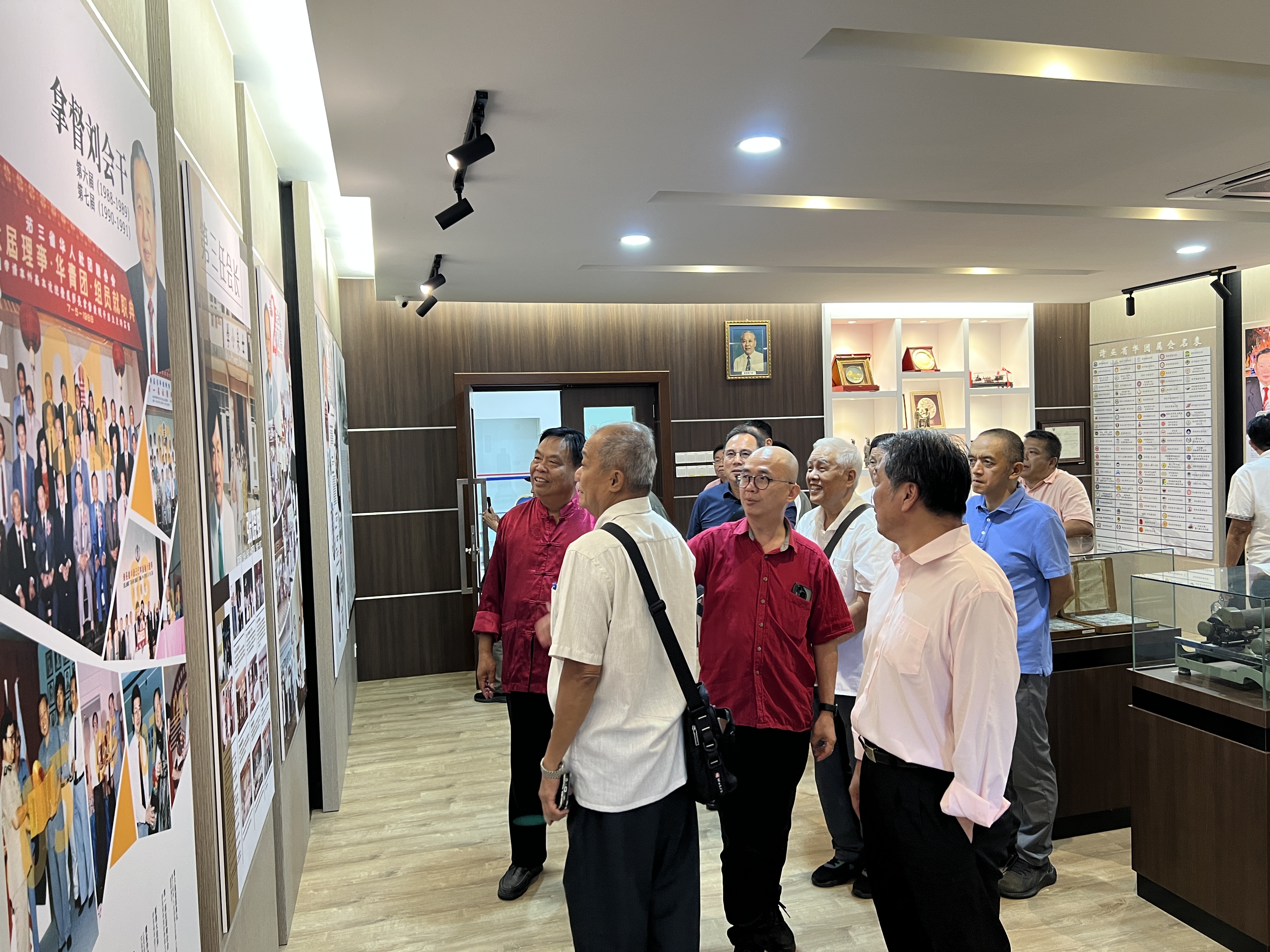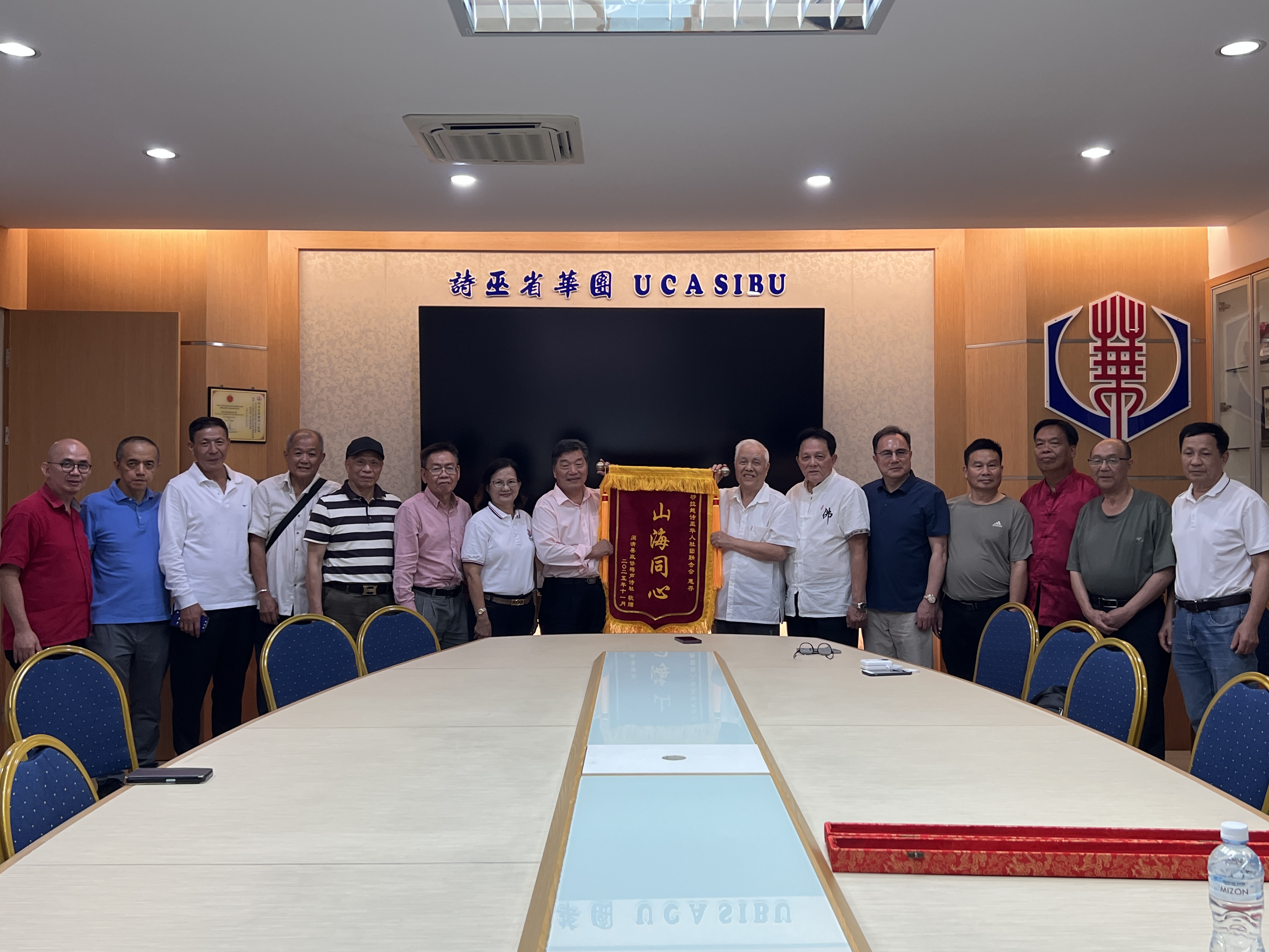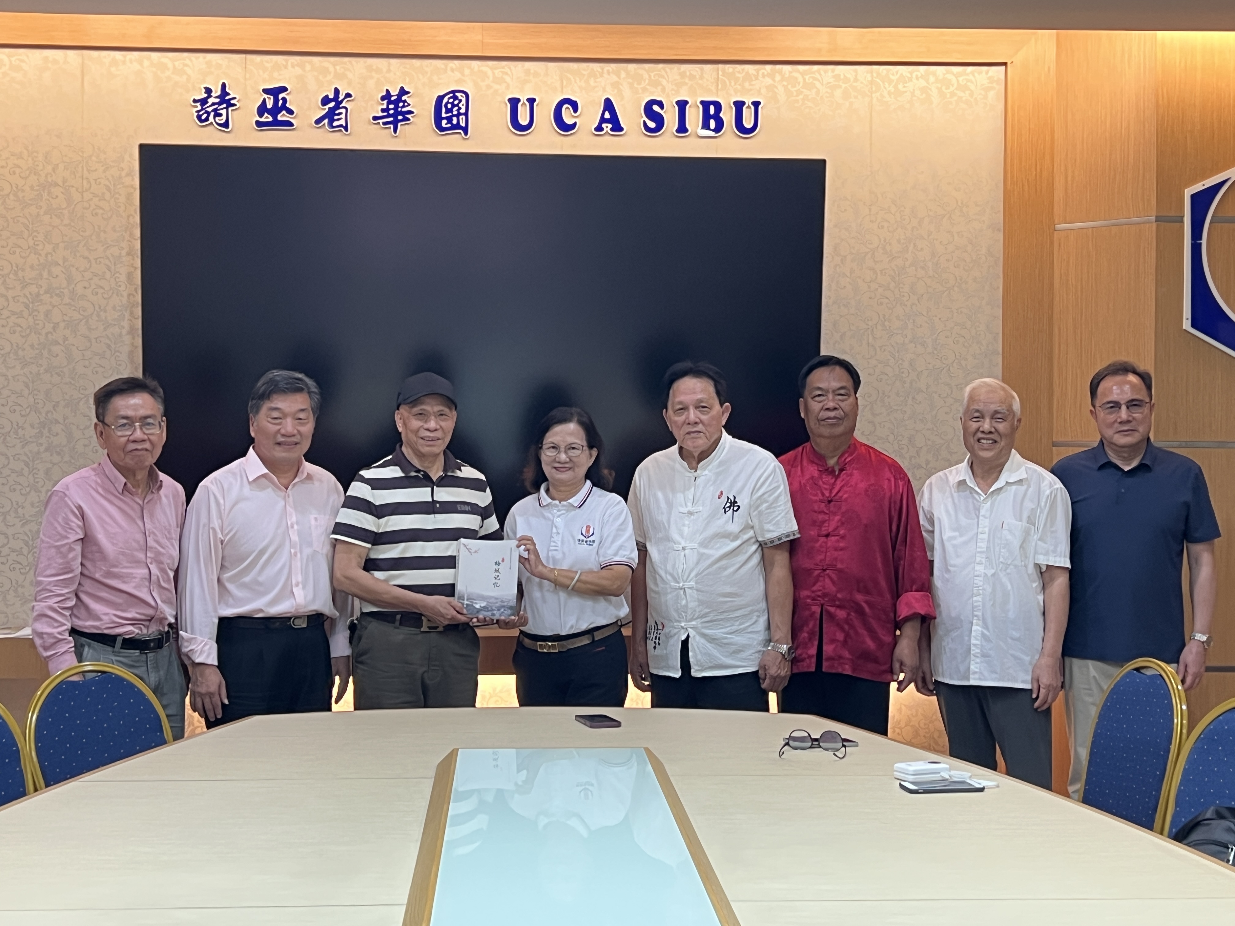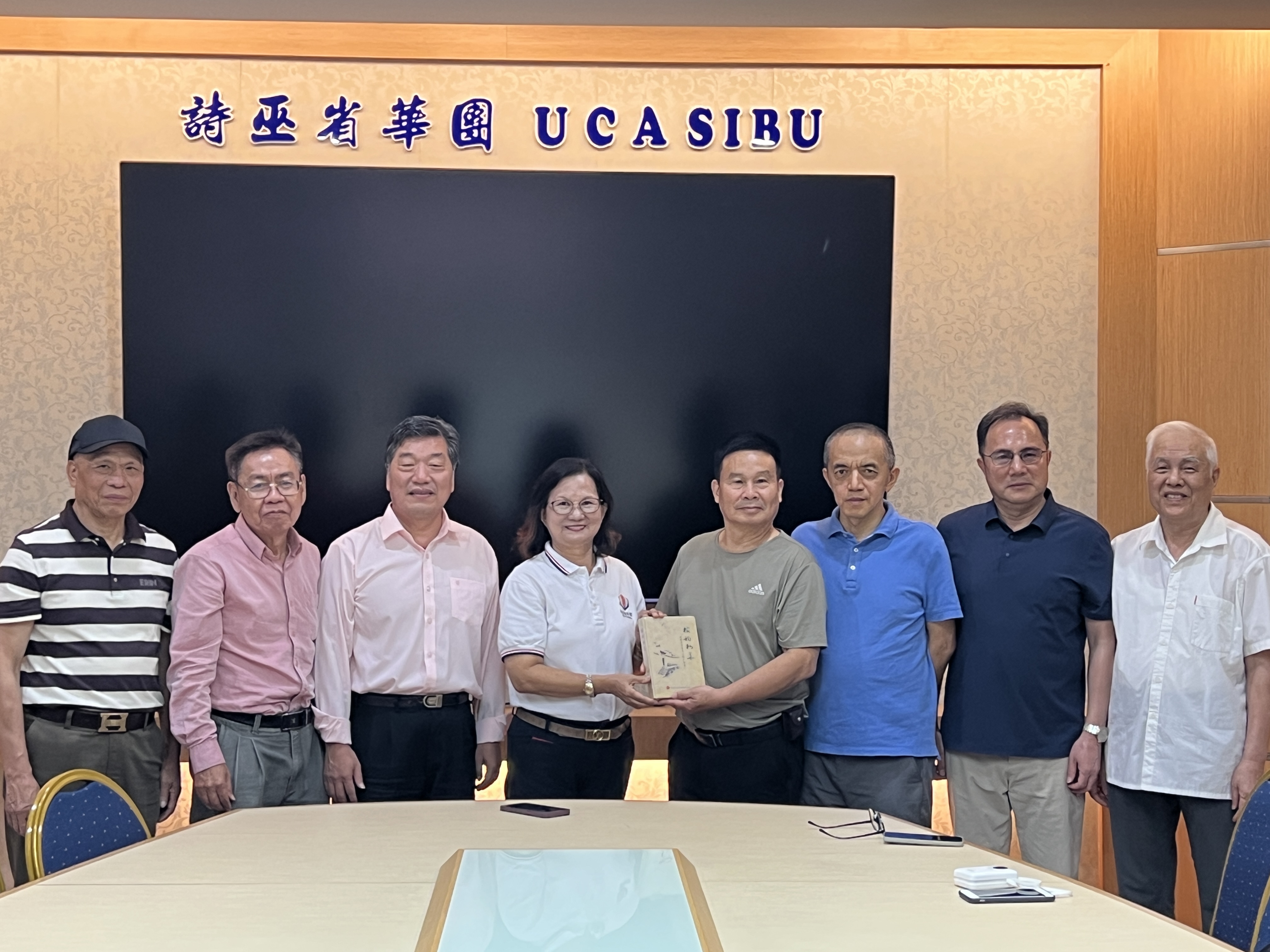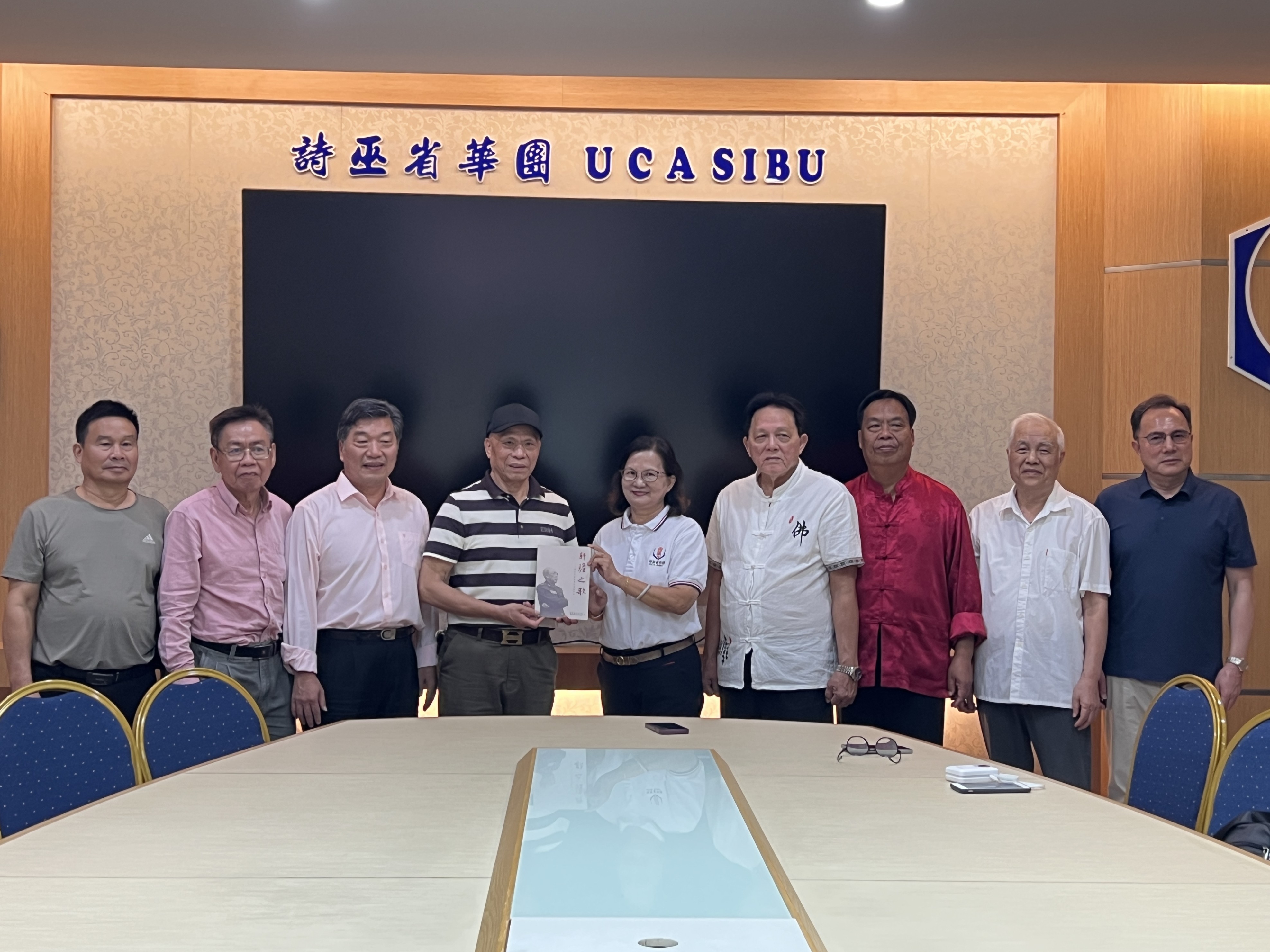 由本会秘书长杨启好(左4)与副秘书苏少萃(左2)赠送本会会刊《新里程》与《诗巫省华团2025手册》予闽清县政协梅声诗社副社长张德团(左3)及闽清县政协梅声诗社社长黄维江(右3)