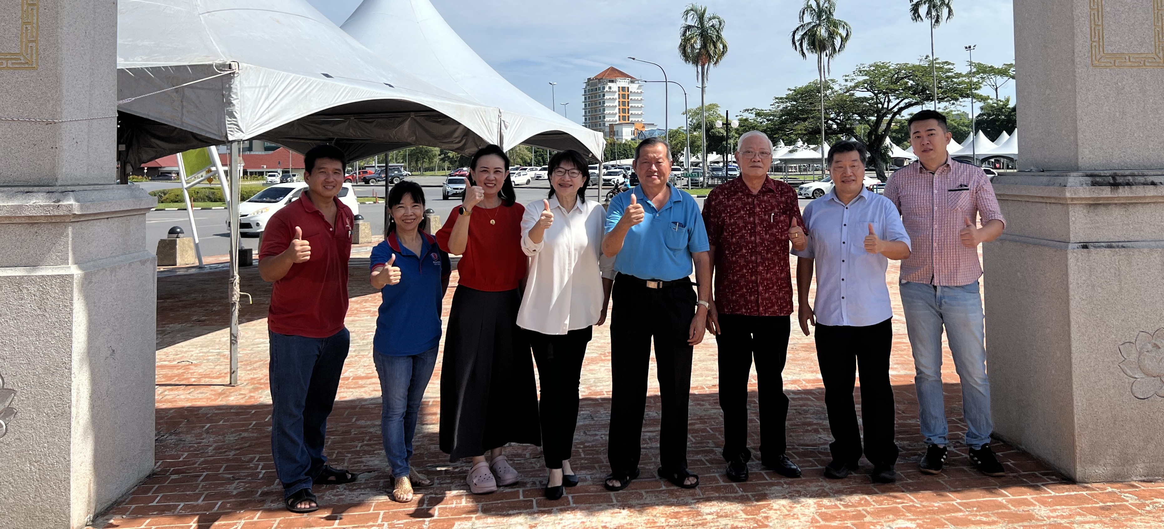 巡查后合影留念。左起为华青团副总务张艺铎,诗巫省华团妇女组秘书黄维玉,秘书处执行秘书张思诗,副会长兼婆罗洲文化节“华族文化风采”副总筹委会主席黄惠萍,诗巫省华团会长刘仁祥,秘书长劉錦虎,副会长兼婆罗洲文化节“华族文化风采”副总筹委会主席杨啟好,诗巫省华青团团长许为建