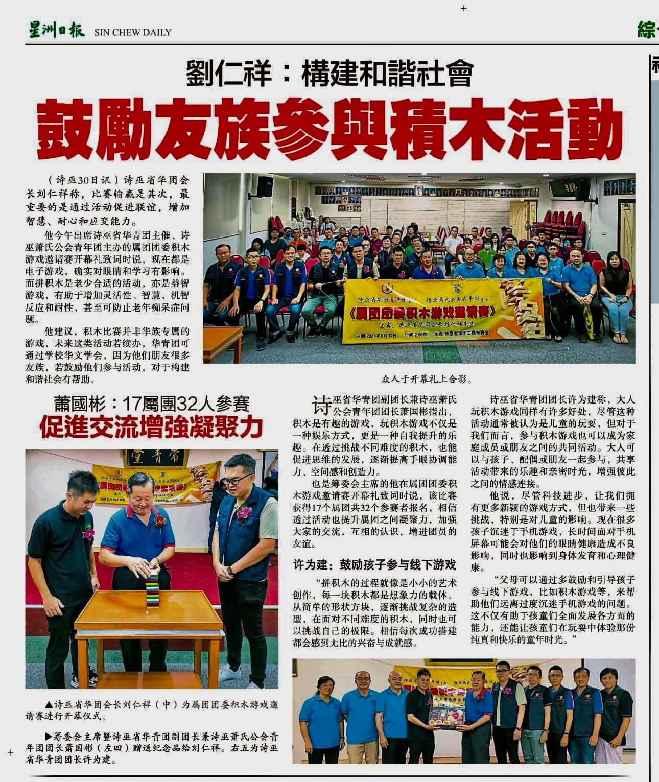 2018年10月13日,诗巫萧氏公会一行人,前从拜访捉蛇达人赖利修先生及参观他住家蛇只 2019年2月16日,诗巫萧氏公会 2019已亥年新春联欢暨孝亲敬老晚会 2019年2月16日,诗巫萧氏公会 2019已亥年新春联欢暨孝亲敬老晚会 2019年9月8日,中秋联欢会暨颁发会员子女教育奖励金晚会 2020庚子年年新春联欢暨敬老晚宴 2020庚子年年新春联欢暨敬老晚宴 2022年10月30日,诗巫省华青团主催,诗巫萧氏公会青年团主办的【属团团委钓虾友谊赛】 【29.01.23 诗巫萧氏公会新春联欢暨敬老晚宴】 诗巫萧氏公会新春联欢暨敬老晚宴,右三为主宾马来西亚旅游、艺术及文化部长,民都鲁区国会议员兼东都区州议员拿督斯里张庆信太平局绅代表砂总理政治秘书丁福营,左三为本会会长萧梧胜 诗巫萧氏公会新春联欢暨敬老晚宴,主宾、本会理事、青年团、妇女组与长者合影 【03.12.23 诗巫华青团主催,诗巫萧氏公会青年团举办【属团团委羽毛球比赛】】 诗巫华青团主催,诗巫萧氏公会青年团举办【属团团委羽毛球比赛】开幕主宾武吉阿瑟区州议员YB钱进一 诗巫华青团主催,诗巫萧氏公会青年团举办【属团团委羽毛球比赛】得奖者合影 【25.02.24诗巫萧氏公会新春联欢暨敬老晚宴】 诗巫萧氏公会新春联欢暨敬老晚宴,右四起本会会长萧梧胜,马来西亚萧氏公会总会总会长萧志国,主宾诗巫省华人社区最高领袖天猛公刘利民,筹备会主席萧国彬 诗巫萧氏公会加入马来西亚萧氏公会总会属会 诗巫萧氏公会新春联欢暨敬老晚宴,主宾、本会理事、青年团、妇女组与长者合影 【19.05.24 诗巫华青团主催,诗巫萧氏公会青年团举办医学健康讲座会【保护家人的有用知识,生活中的急救技巧】】 诗巫华青团主催,诗巫萧氏公会青年团举办医学健康讲座会【保护家人的有用知识,生活中的急救技巧】,主宾武吉阿瑟区州议员YB钱进一 出席者体验身体检测 活动现场 【30.06.24 诗巫华青团主催,诗巫萧氏公会青年团举【属团团委积木游戏邀请赛】】 诗巫华青团主催,诗巫萧氏公会青年团举【属团团委积木游戏邀请赛】,右五起华青团团长许为健,筹备会主席萧国彬,主宾诗巫省华团会长刘仁祥 主宾诗巫省华团会长刘仁祥为活动开幕 活动现场 【16.08.24 诗巫华青团主办,诗巫萧氏公会青年团联办2024年婆罗洲文化节 华族童玩之——纸弹弓】 诗巫华青团主办,诗巫萧氏公会青年团联办2024年婆罗洲文化节 联合开幕,主宾诗巫萧氏公会查账市议员萧仁和 所有得奖者合影 【10.09.24 新届理事就职、中秋联欢及颁发会员子女奖励金】 新届理事就职、中秋联欢及颁发会员子女奖励金,主宾砂公共卫生、房屋及地方政府部副部长兼柏拉旺区议员 YB 拿督程明智 萧梧胜荣选为新届会长 青年团就职仪式,新届团长萧国彬 萧憶惠荣选妇女组主任 会员子女奖励金合影 【08.02.25 诗巫萧氏公会新春联欢暨敬老晚宴】 诗巫萧氏公会新春联欢暨敬老晚宴,右六起筹备会主席萧圣皇,主宾马来西亚国会下议院副议長兼诗巫南兰区国会议员 理事、青年团、妇女组联合共切蛋糕 颁发长者红包2018年活动照片