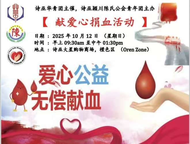 诗巫省华青团配合主题【团结青年,强我组织;传承文化,强大华社】主催,诗巫颍川陈氏公会青年团于2025年10月12日(星期日)假诗巫大星第一购物商场,橙色空间(Oren Zone)主办《献爱心捐血活动》。