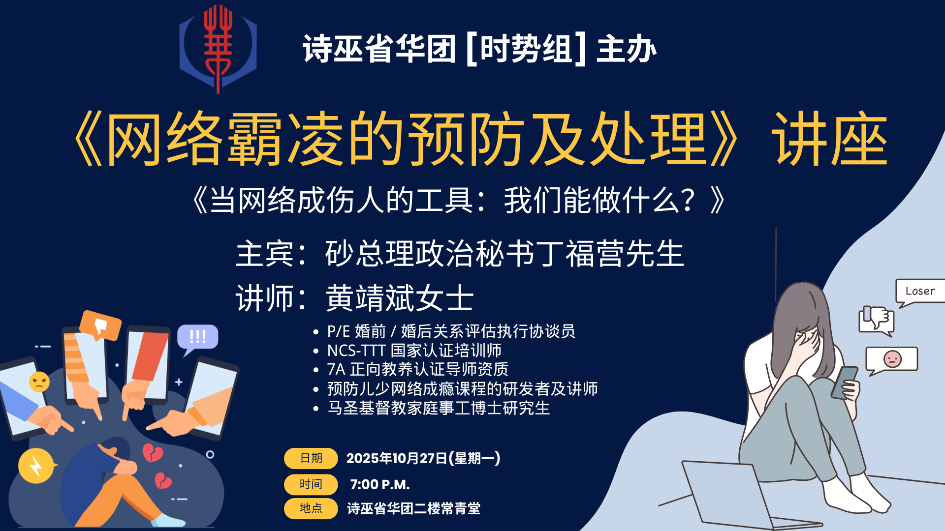 为帮助大家了解如何预防、处理及制止霸凌事件,共同营造安全、友善的环境,进一步提高大众对霸凌行为的认识与警觉,增强自我保护与同理意识。诗巫省华团【时势组】将于2025年10月27日晚上7时在本会二楼常青堂举办“防霸凌讲座会”。