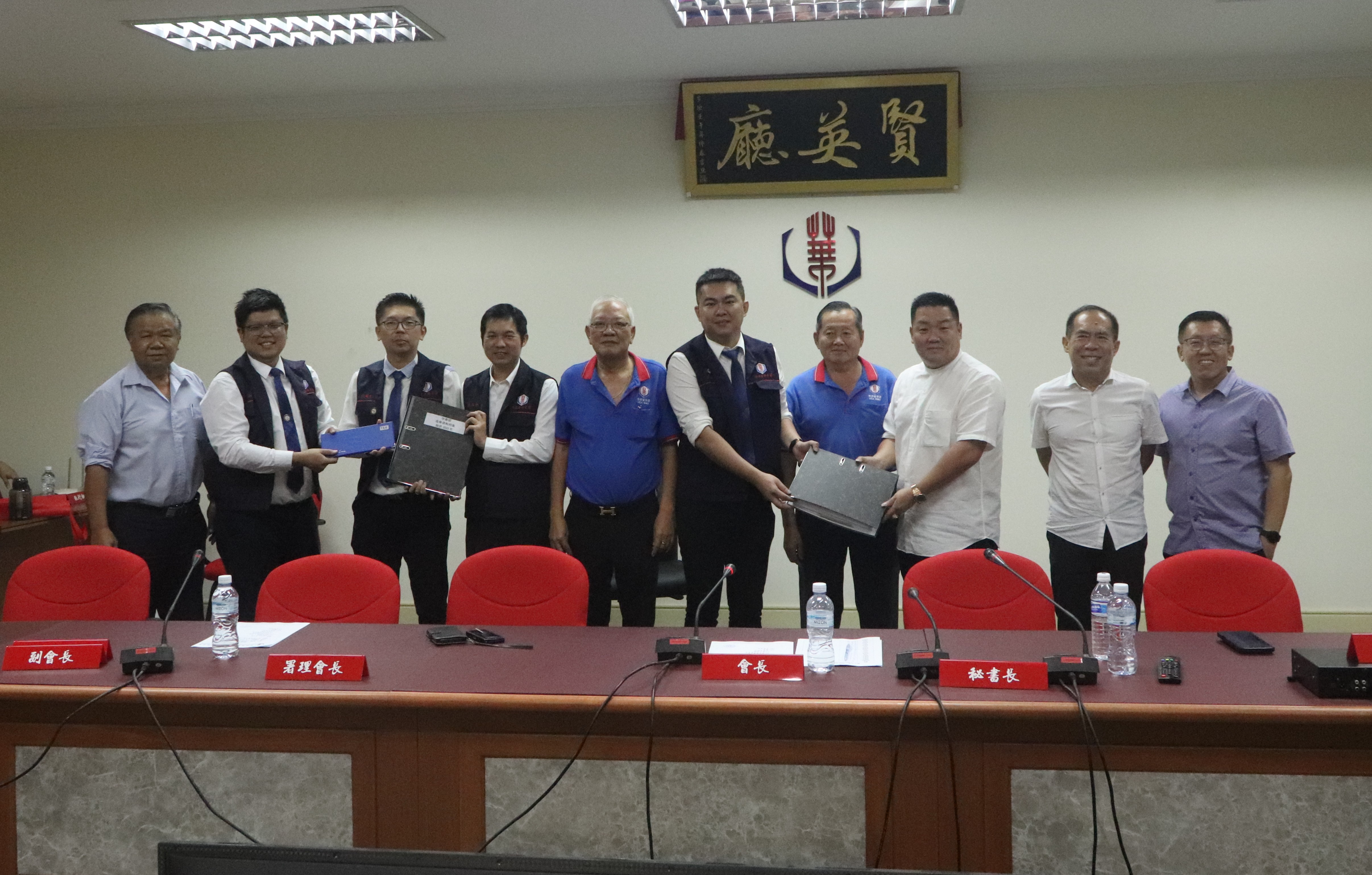 在诗巫省华青团咨询长陈俊宏(右1),执行顾问许益品(右2)、会长刘仁祥(右4)、咨询长江贤钦(左1)、秘书长劉錦虎(左5)见证下、由第十八届华青团团长许为建(左5)、财政胡伟平、秘书张均发、移交职权予新届第十九届华青团团长杨仁福县议员、财政张均发,秘书萧国彬