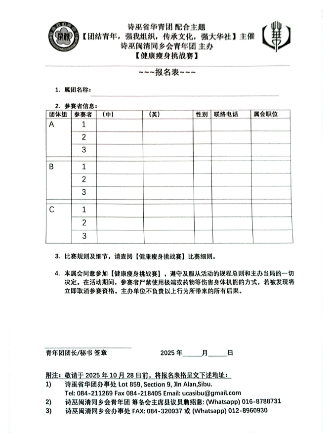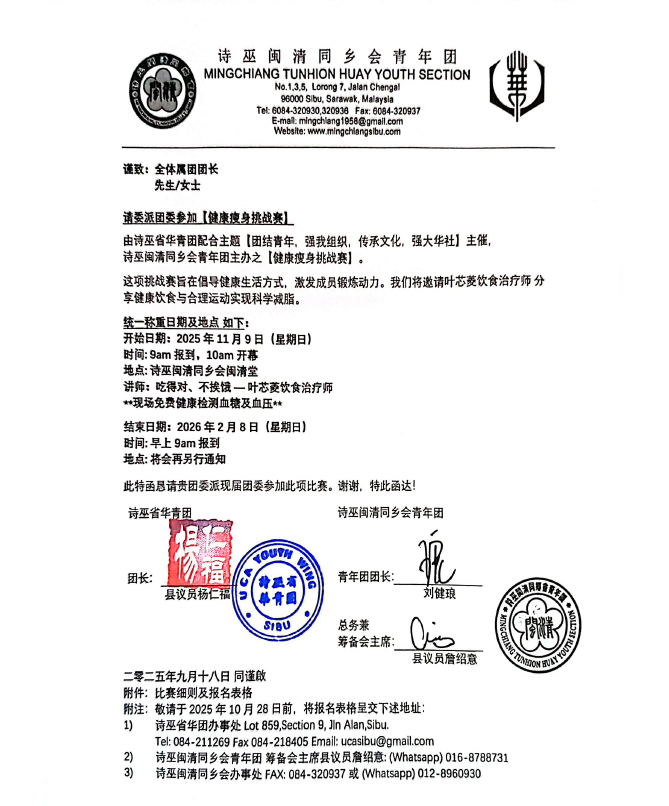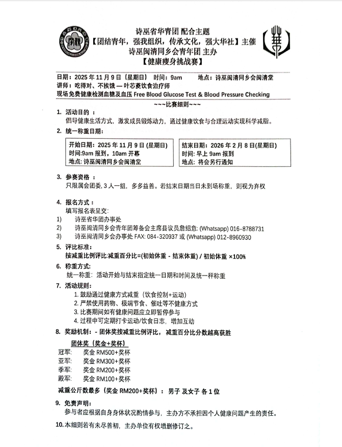 由诗巫省华青团配合主题【团结青年,强我组织,传承文化,强大华社 】主催,诗巫闽清同乡会青年团主办的【健康瘦身挑战赛】即将开幕。诚邀属团团委共赴这场活力与蜕变的约定!