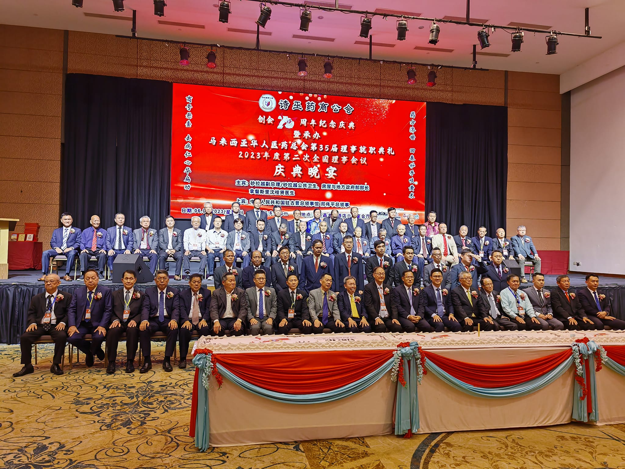 众嘉宾合影于诗巫药商公会创会70周年纪念庆典。