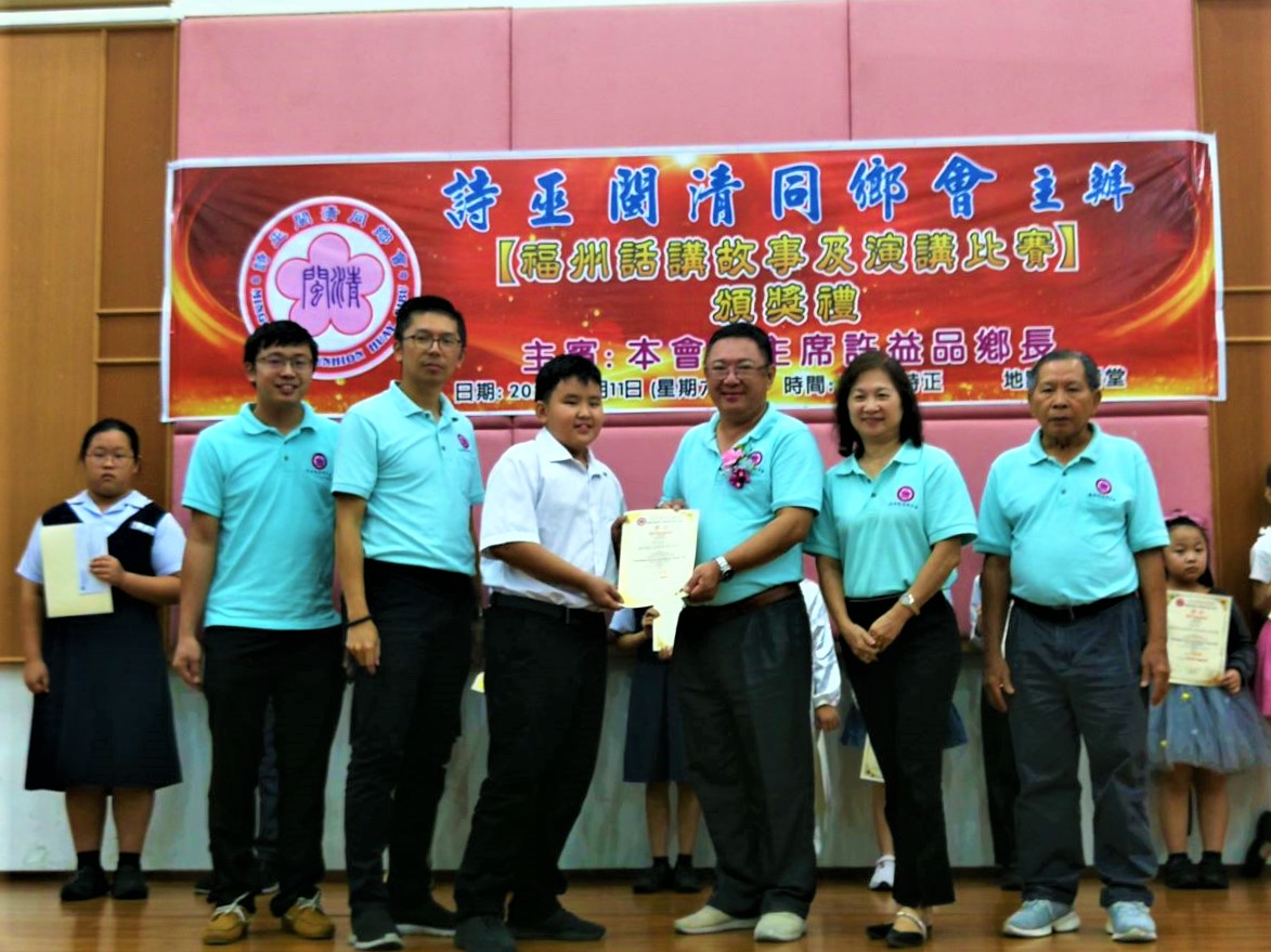 诗巫闽清同乡会福州话讲故事及演讲比赛筹委会主席许进潍(右三)颁发小学组福州话讲故事冠军奖项予周富磊。