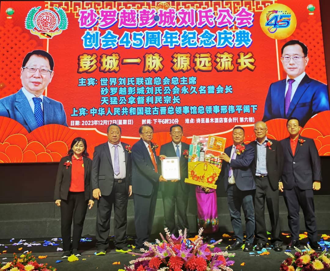 “百多年来,砂拉越刘氏人才辈出,在反抗殖民、垦殖创业、发展公益、致力华教等方面功勋卓着。砂拉越彭城刘氏公会创会45年来,见证砂拉越风物变迁,不仅实现与当地民族共生共存共荣,也为增进中马、中砂友谊,促进双边经贸合作与各领域交流作出重要贡献。”
