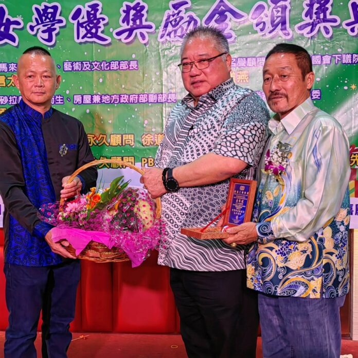 诗巫工商会馆会长方孝丰赠送纪念品予马来西亚旅游、艺术及文化部长拿督斯里张庆信太平局绅。右为筹备会主席郑隆保。