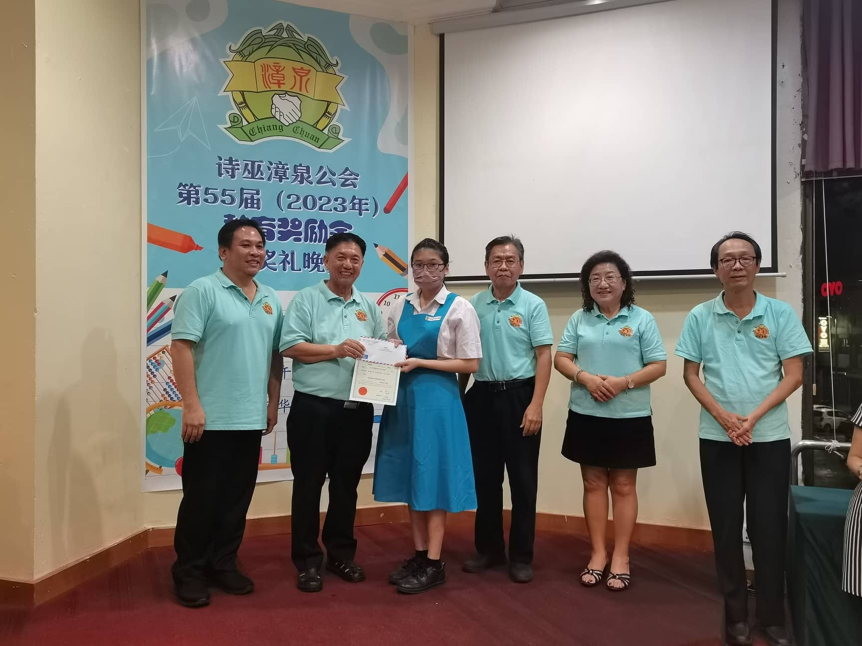 诗巫漳泉公会主席林洪辉(左二)颁发会员子女教育奖励金予优异学生。左为文教组主任林小安;右起为财政蔡福祥、秘书甲必丹沈董妃、署理主席苏少萃。