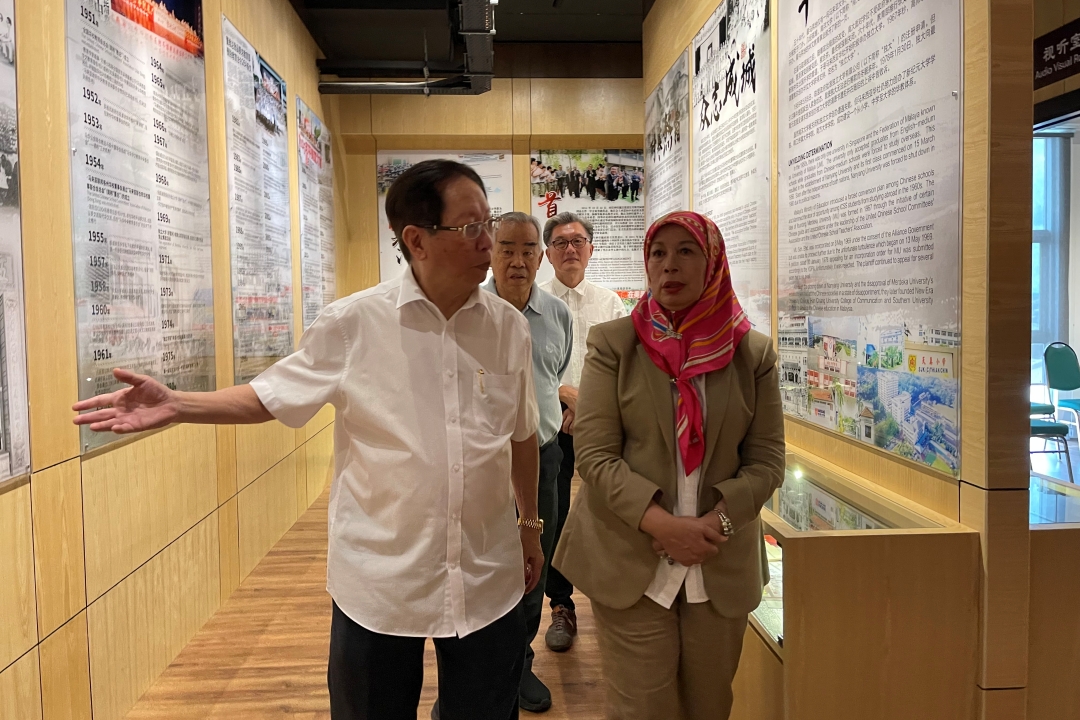 砂拉越华文独立中学董事会联合总会会长兼诗巫省华文独立中学董事联合会主席天猛公拿督刘带领已故前砂首长丕显斯里阿德南夫人拿督阿玛查米拉参观华教文物馆,了解砂华教的发展。