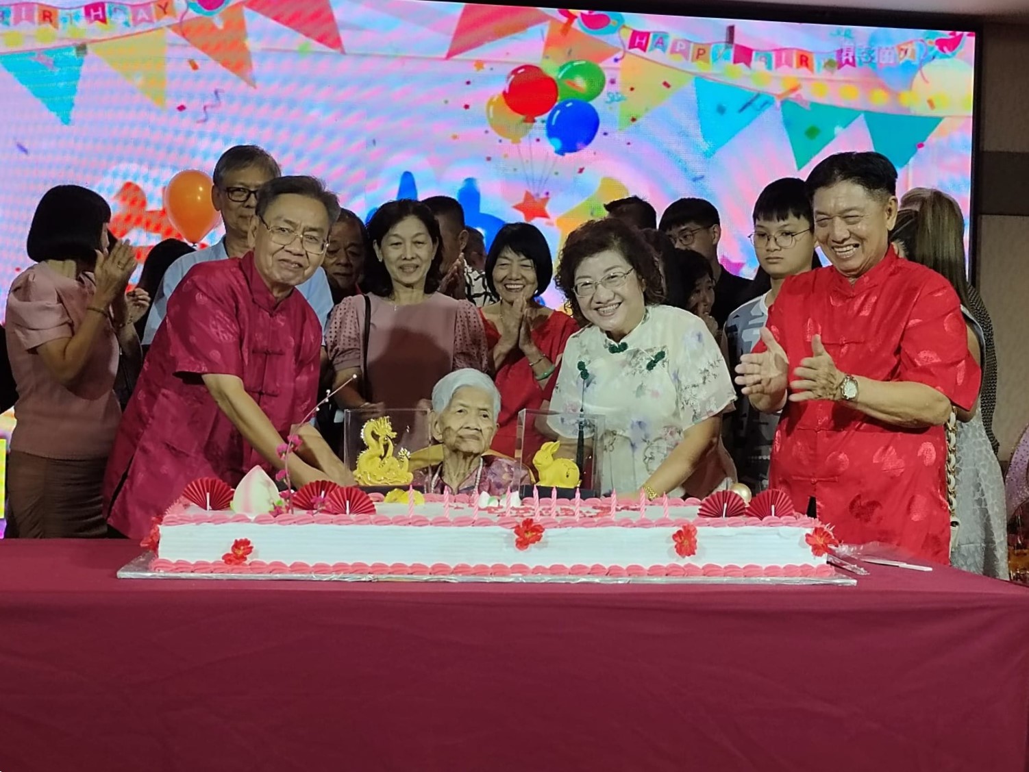 诗巫漳泉公会新春联欢晚宴上,大会也为主席林洪辉的母亲林吴美因(坐者)庆祝100岁生日。