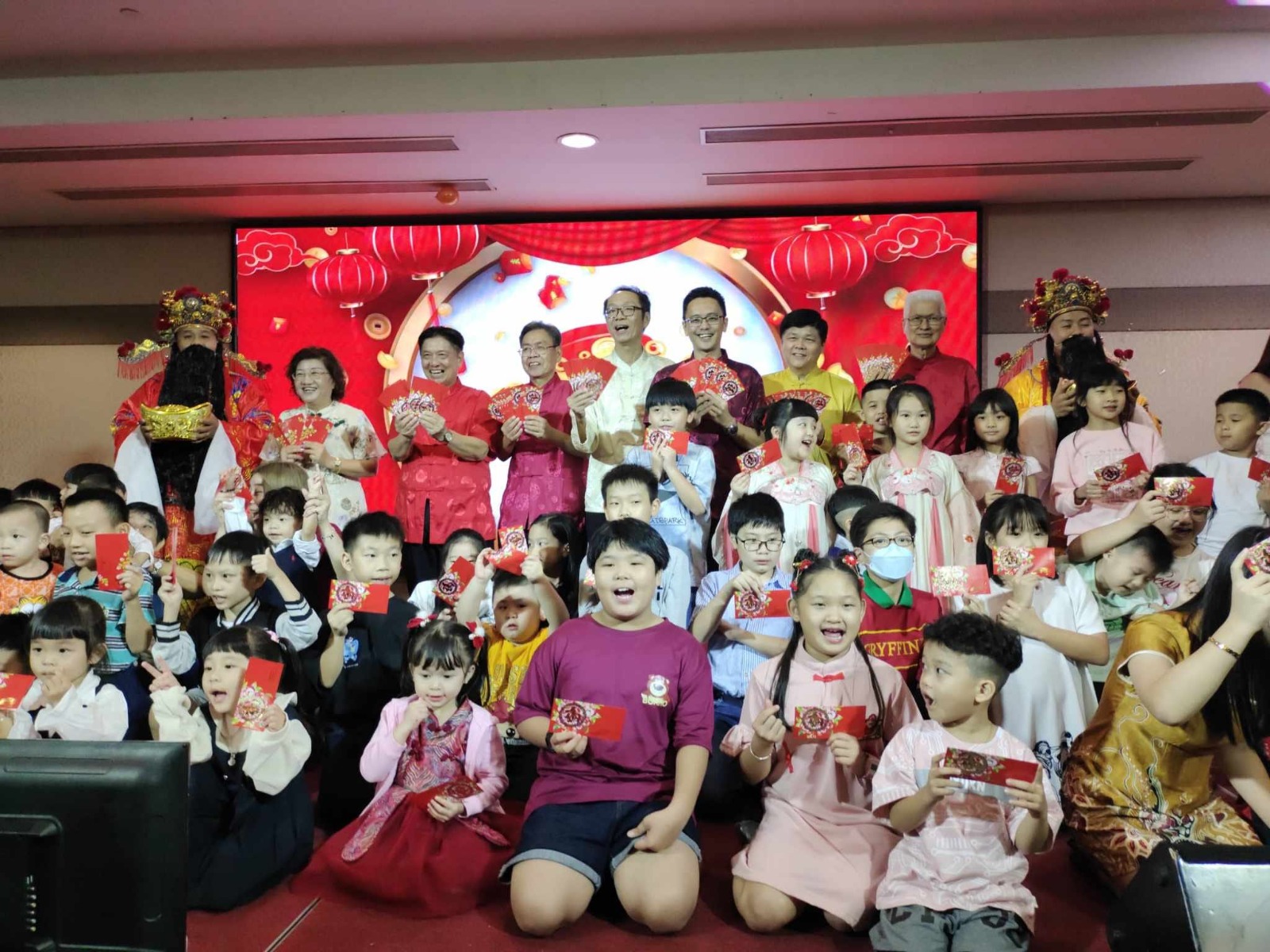 12岁以下儿童领取红包后与主办方合影。