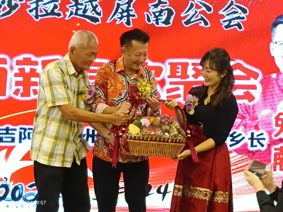 砂拉越屏南公会会长杨荣兴(左)及筹备会主席魏美凤(右)联合赠送水果礼篮予拿督钱本统。