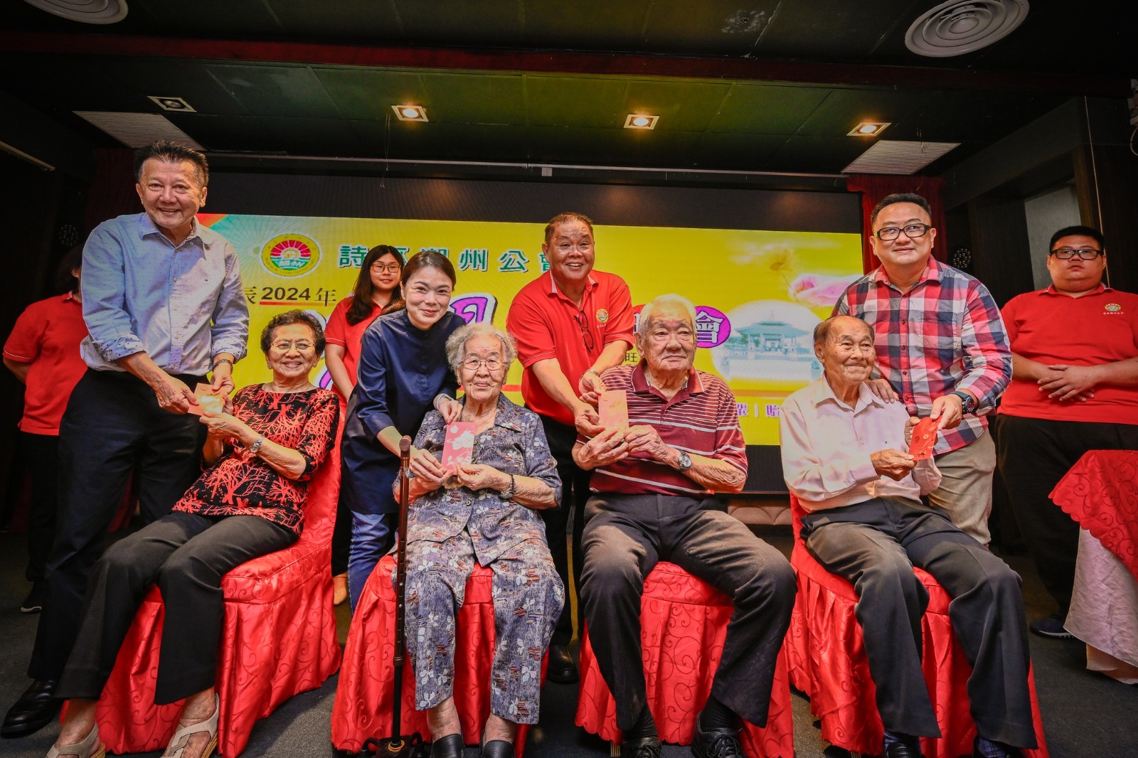 各受邀嘉宾、乡属公会主席及公会领导,派发敬老红包予现场逾80名高龄长者。左三及右一为主席甲必丹舒玉麒及青年团长舒晓雯。