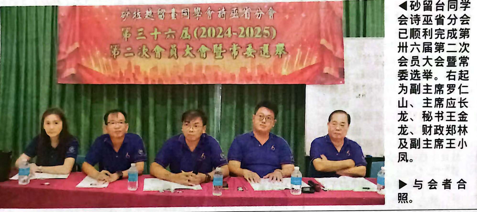 砂拉越留台同学会诗巫省分会于日前召开第36届(2024年至2025年度)第2次会员大会暨常委选举。大会顺利完成改选程序,应长龙、王金龙及郑林分别连任第37届(2026年至2027年度)主席、秘书及财政职。