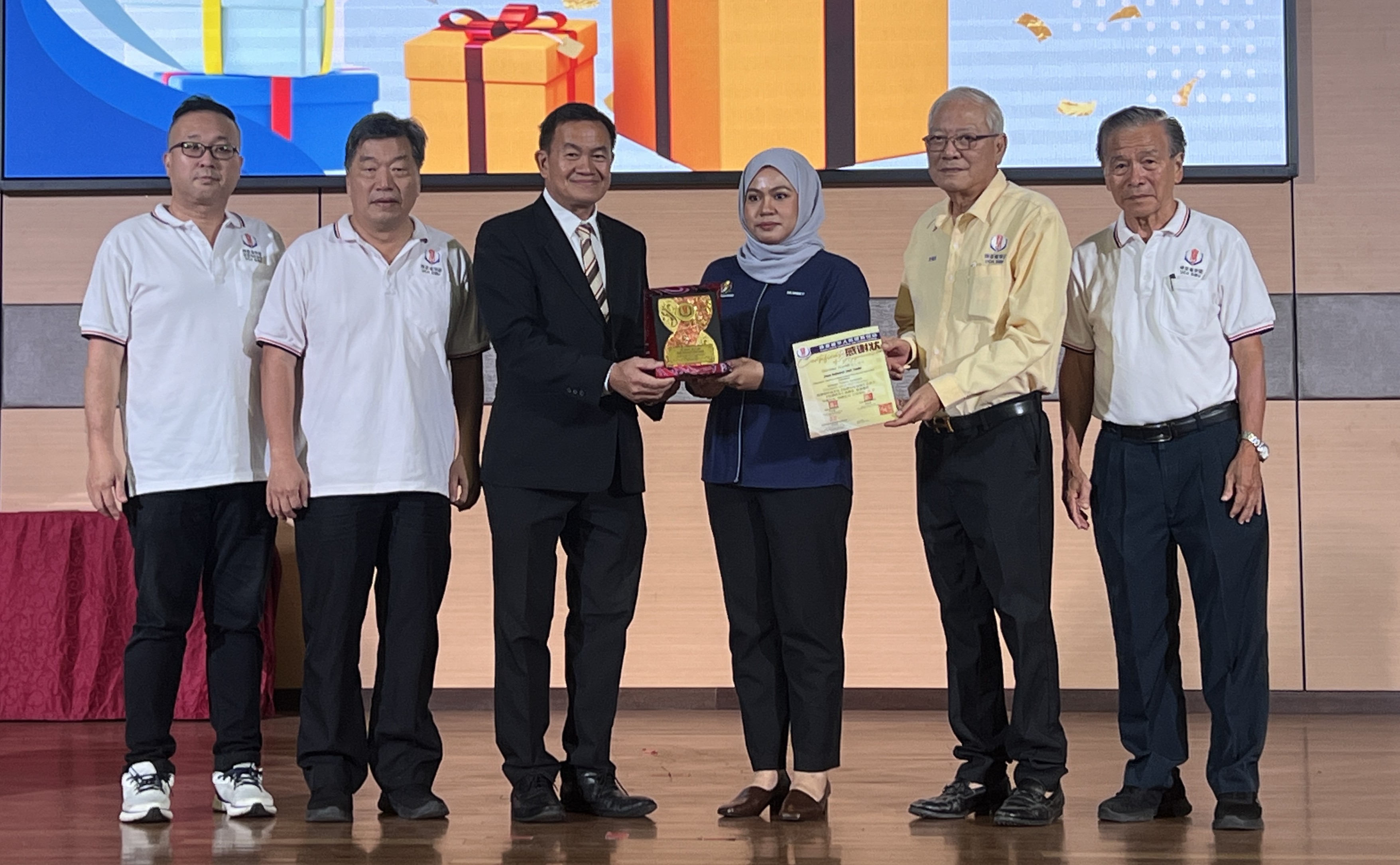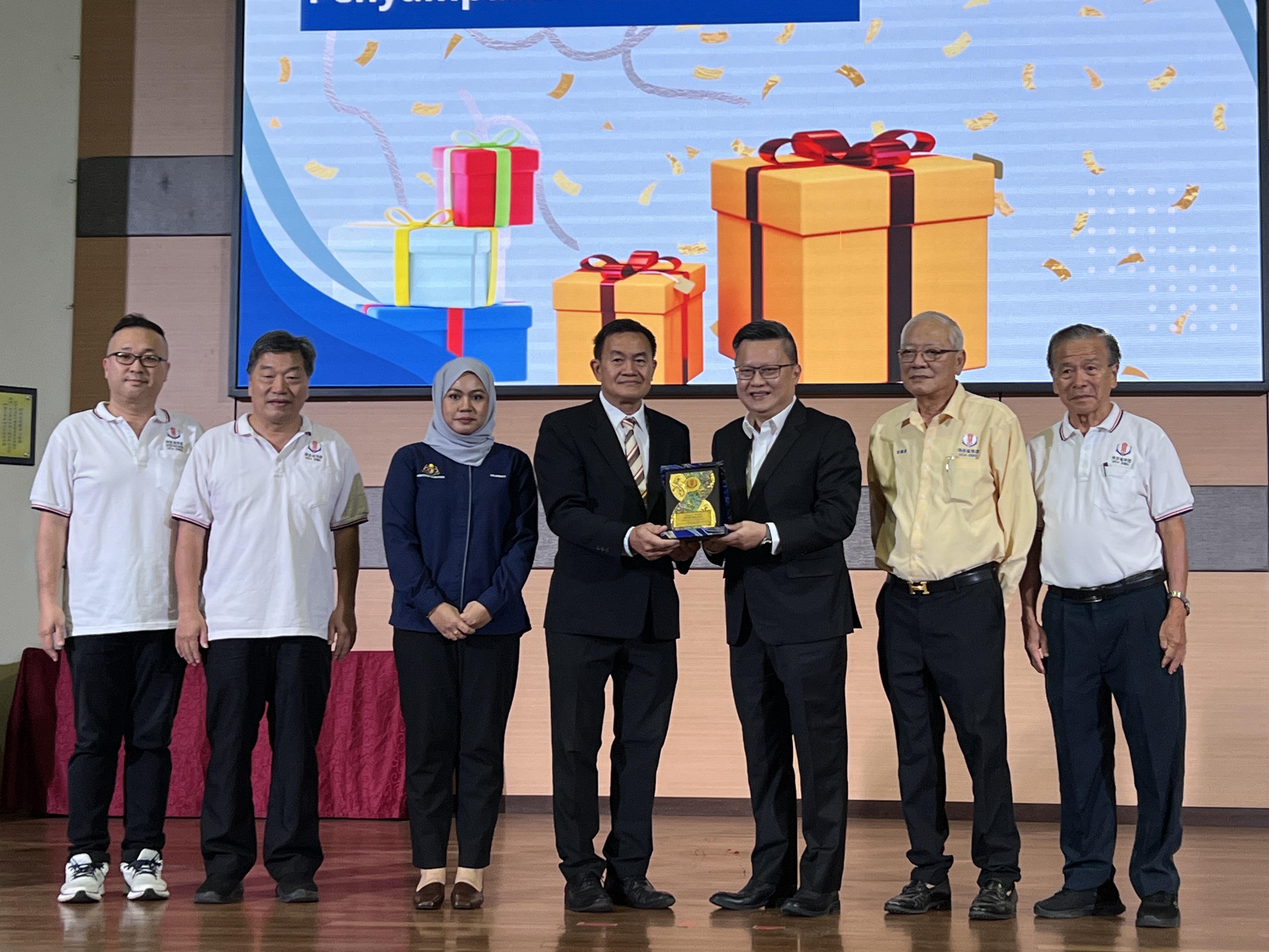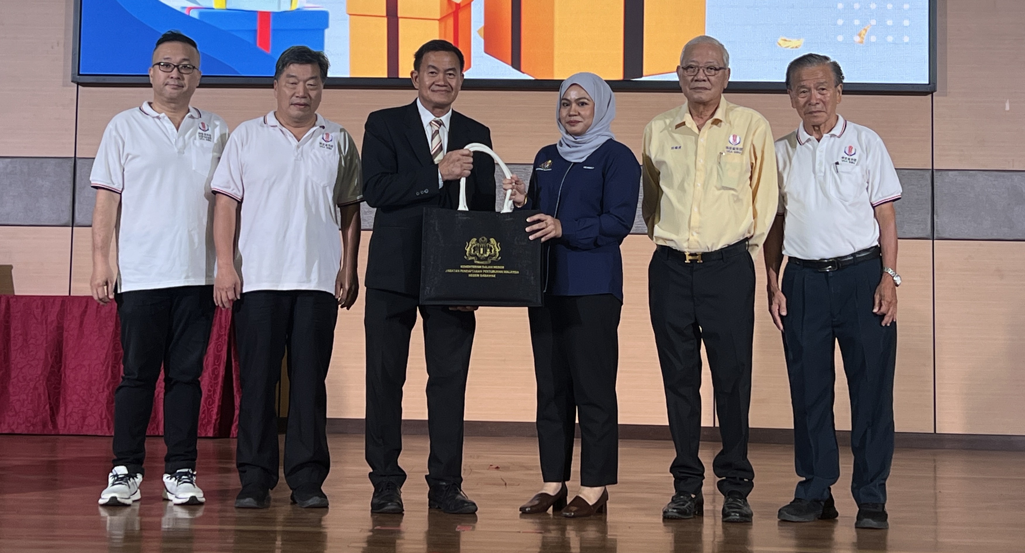 由本会会长严学德(左3)及执行顾问劉錦虎(右2)赠送纪念品与奖状予砂拉越社团注册局总监哈嘉瓦蒂。左1及左2为筹备会主席严生祥及秘书长杨启好。右1为财政张锦兴