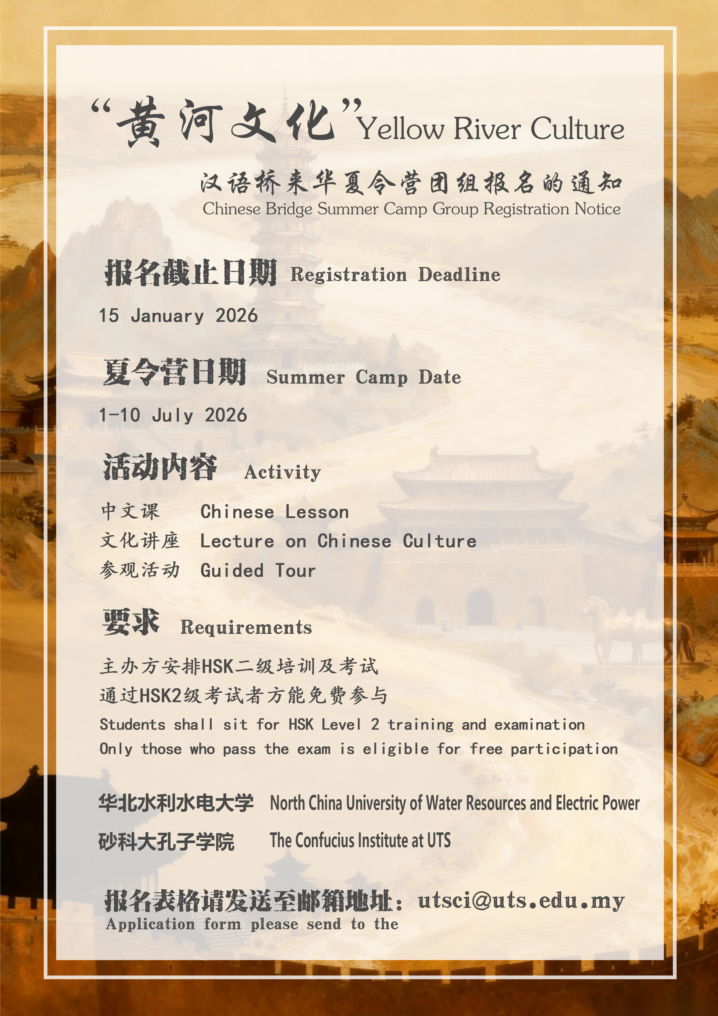 为让更多非华裔中学生感受中文魅力与黄河文明,由华北水利水电大学主办,将于 2026 年 7 月 1 日 - 10 日开展,为期 10 天的“黄河文化” 汉语桥来华夏令营 。