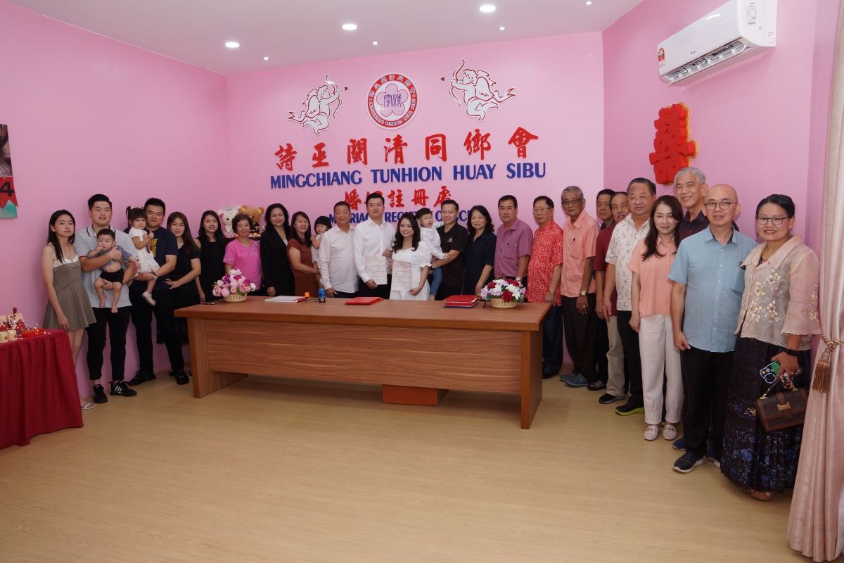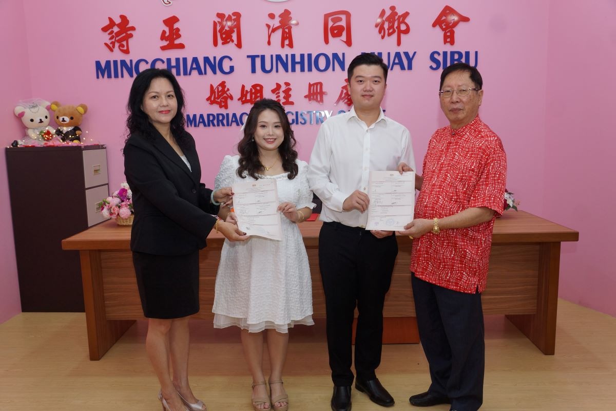 2月24日早的注册仪式由诗巫省华人社区最高领袖天猛公拿督刘利民担任证婚人。出席观礼的有双方家人和亲戚朋友。