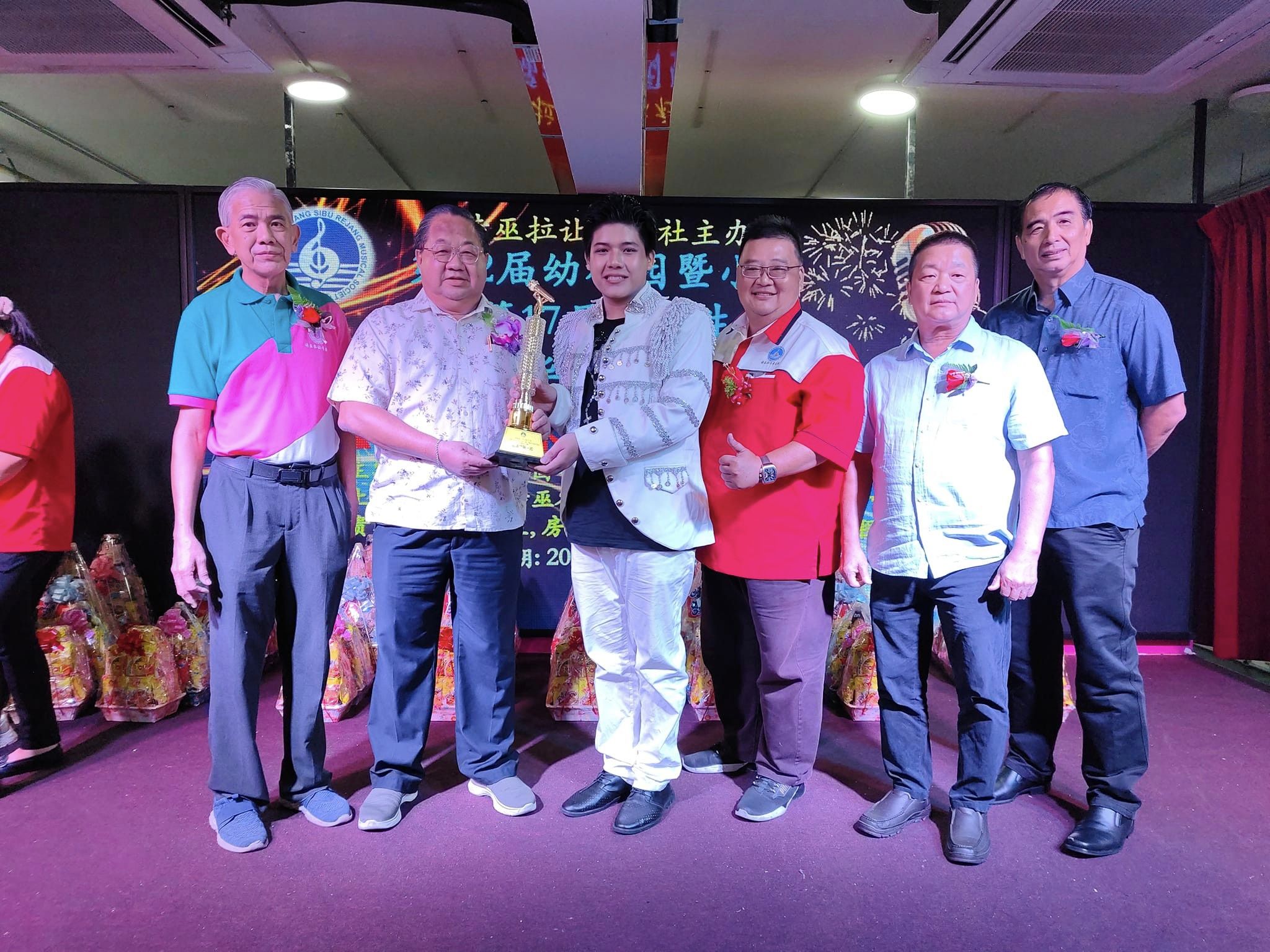 诗巫拉让音乐社永久名誉社长拿督刘义华(左二)颁发校际歌唱赛团体杯小学组冠军奖杯给大群小学的代表。左为诗巫拉让音乐社主席詹世坤;右起为诗巫拉让音乐社署理主席林汉武、社长刘恭福、筹委会主席苏铭庆。