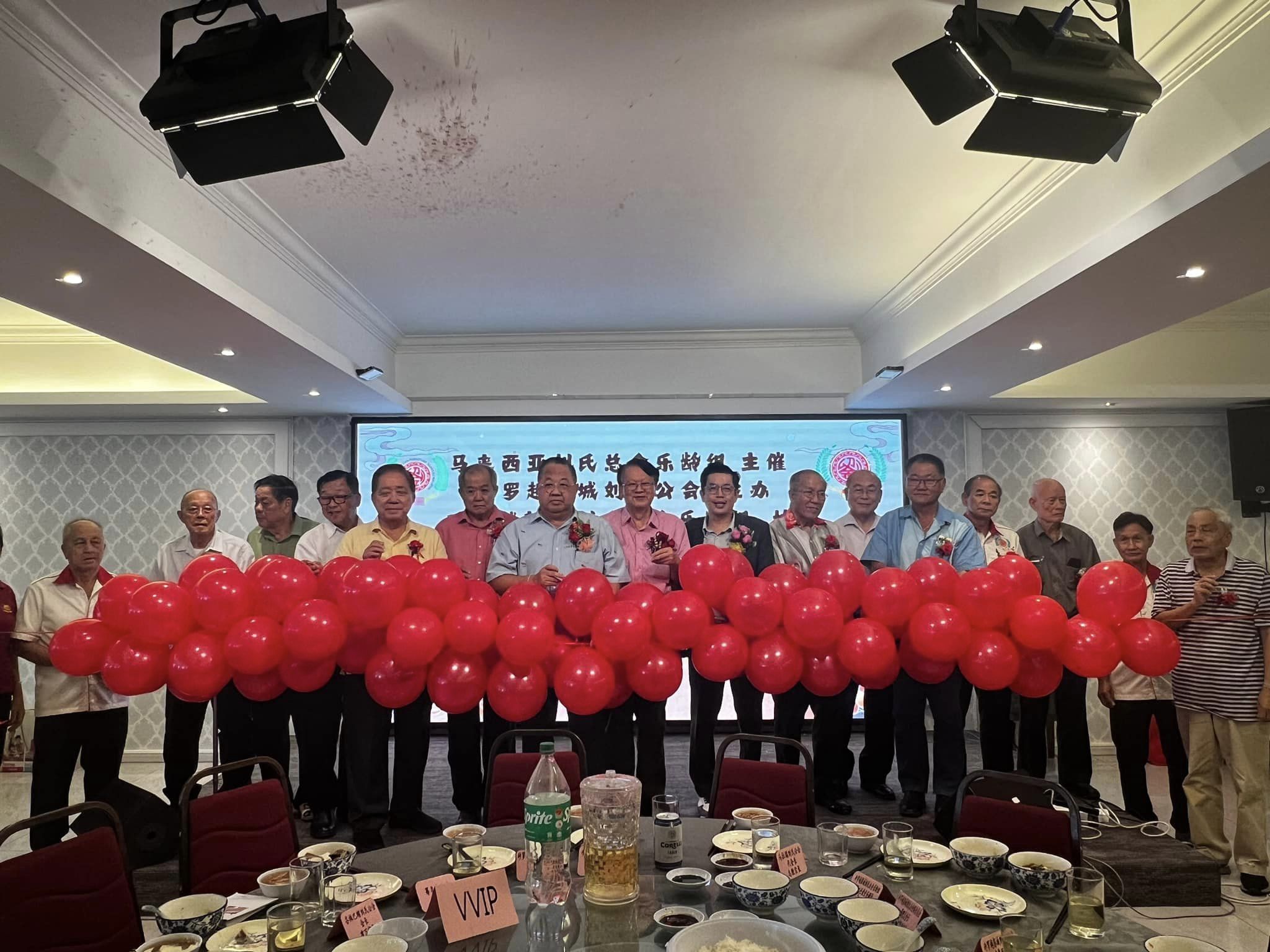 众嘉宾联合为2024年重阳节午宴主持爆彩球开幕仪式。左起为砂彭城刘氏公会乐龄组主任刘兴勇、副会长刘庆成、永久名誉主席拿督刘增强、峇株巴辖刘氏公会会长刘建万、砂彭城刘氏公会永久名誉主席刘本武、筹备会主席刘乃逖、主席刘贤远、主宾暨会长刘伯举;马来西亚刘氏总会总会长刘博文、砂彭城刘氏公会联合总会署理总会长天猛公刘贤敏、砂彭城刘氏公会名誉顾问拿督刘义华、马拉端刘氏公会代会长刘志敦、砂彭城刘氏公会联合总会乐龄总主任刘织强、砂彭城刘氏公会乐龄组名誉主任兼会务顾问刘斌、马来西亚刘氏总会乐龄组总主任刘扬斌及砂彭城刘氏公会副会长刘世南。