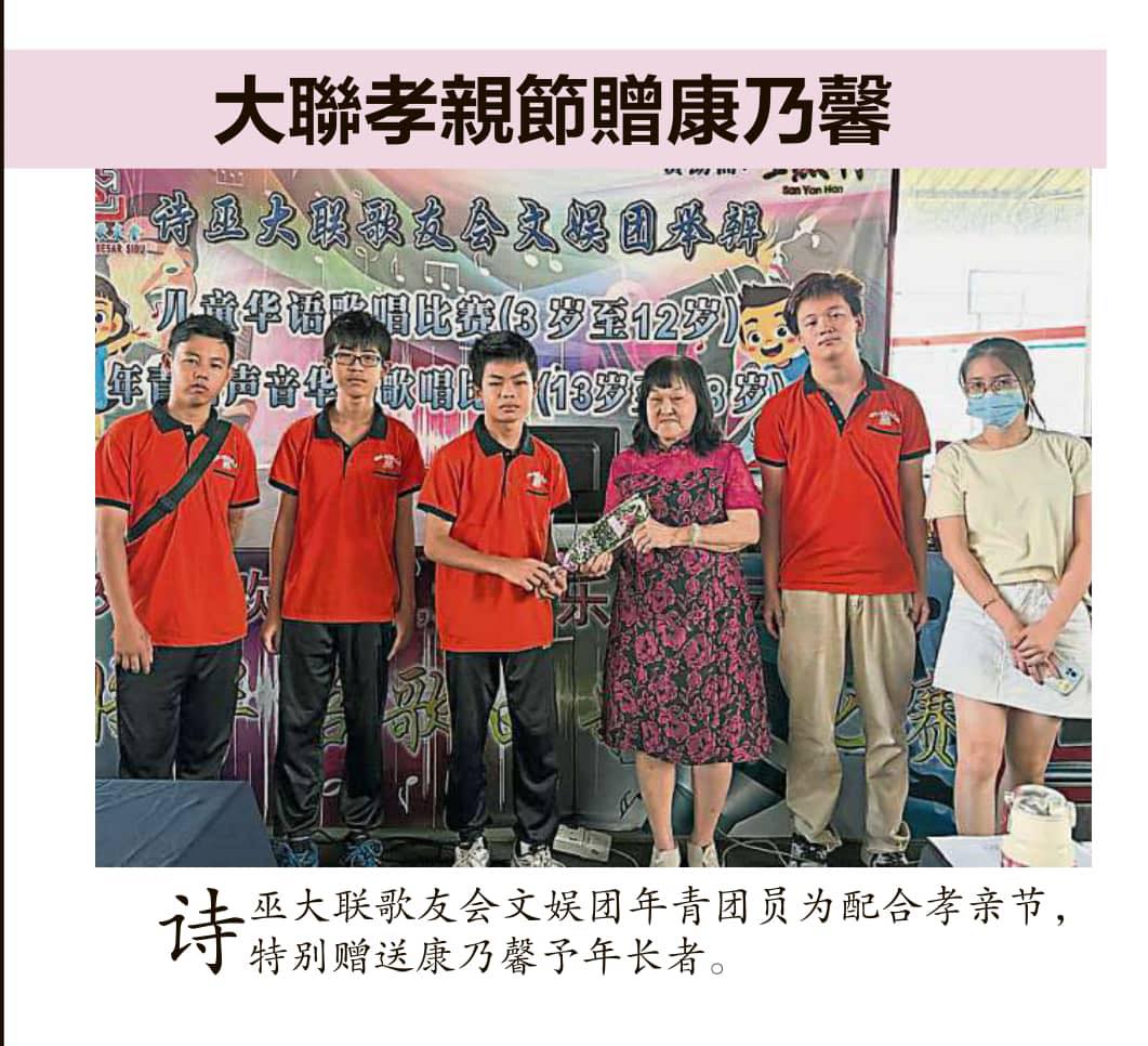 诗巫大联歌友会文娱团于2025年5月11日祝孝亲节,赠送康乃謦花朵于公众。