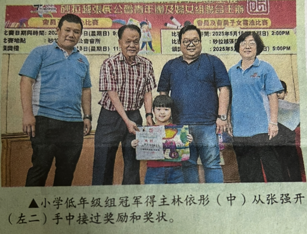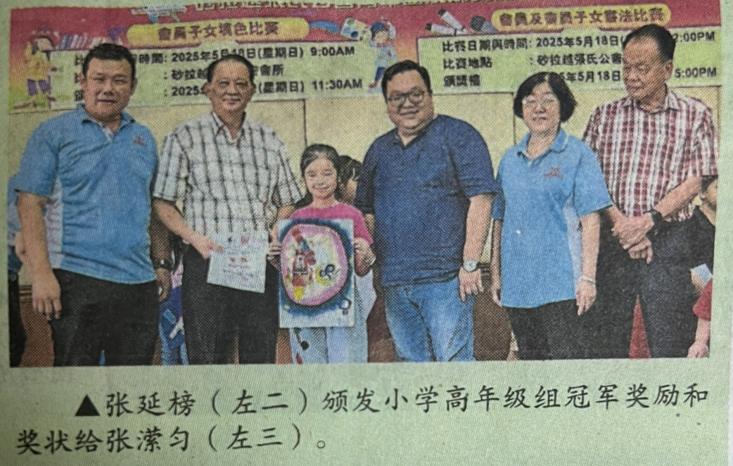 砂张氏联合总会青年团主催,砂张氏公会青年团及妇女组联办的会员子女填色比赛成绩出炉,分别由彭颂泽、林依彤和张潆匀获得幼儿组、小学低年级组及小学低年级组冠军奖。
