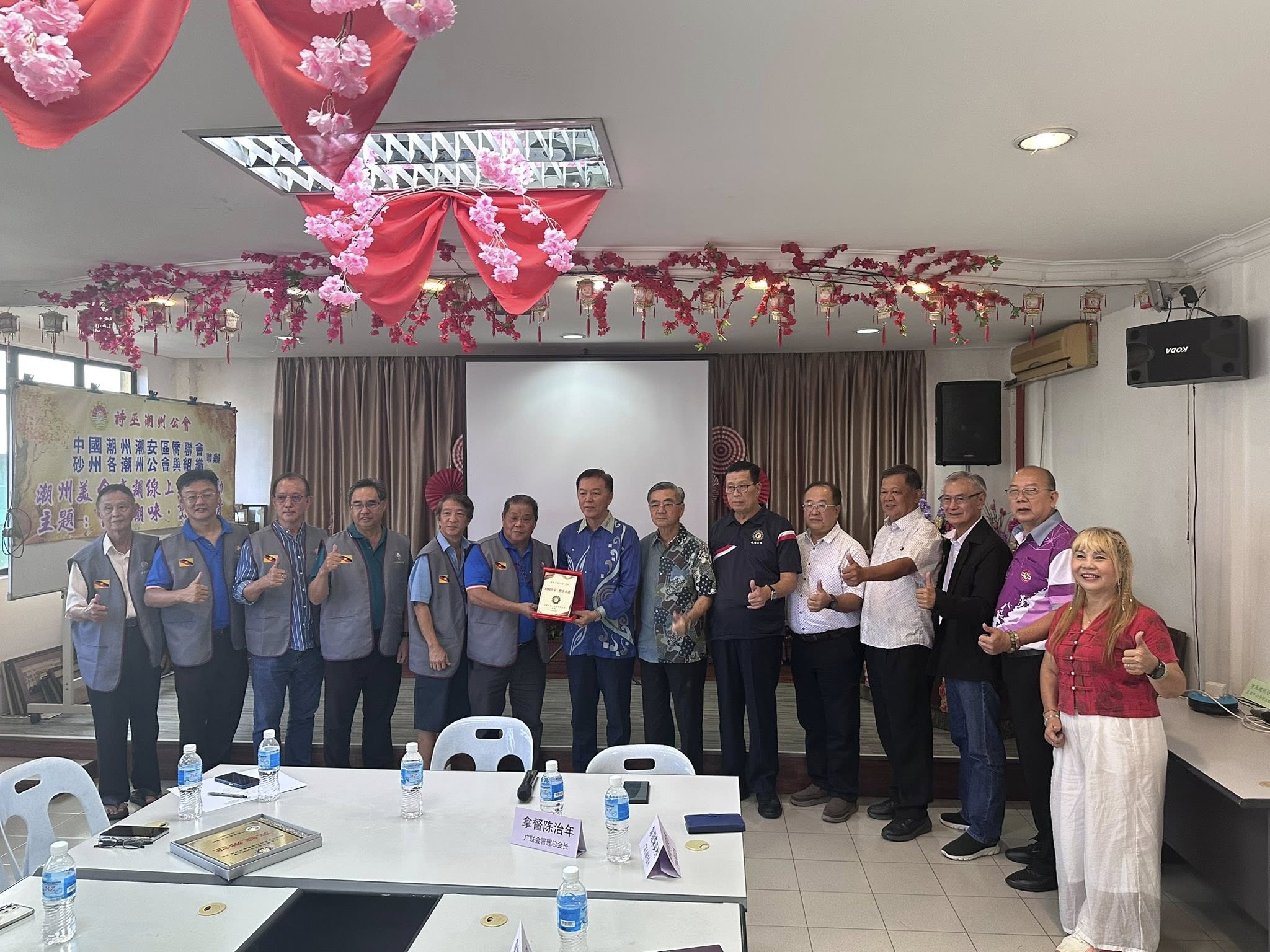 赠送纪念品环节。左6起为诗巫广东公会主席甲必丹舒玉麒及马广联会署理总会长拿督陈治年。