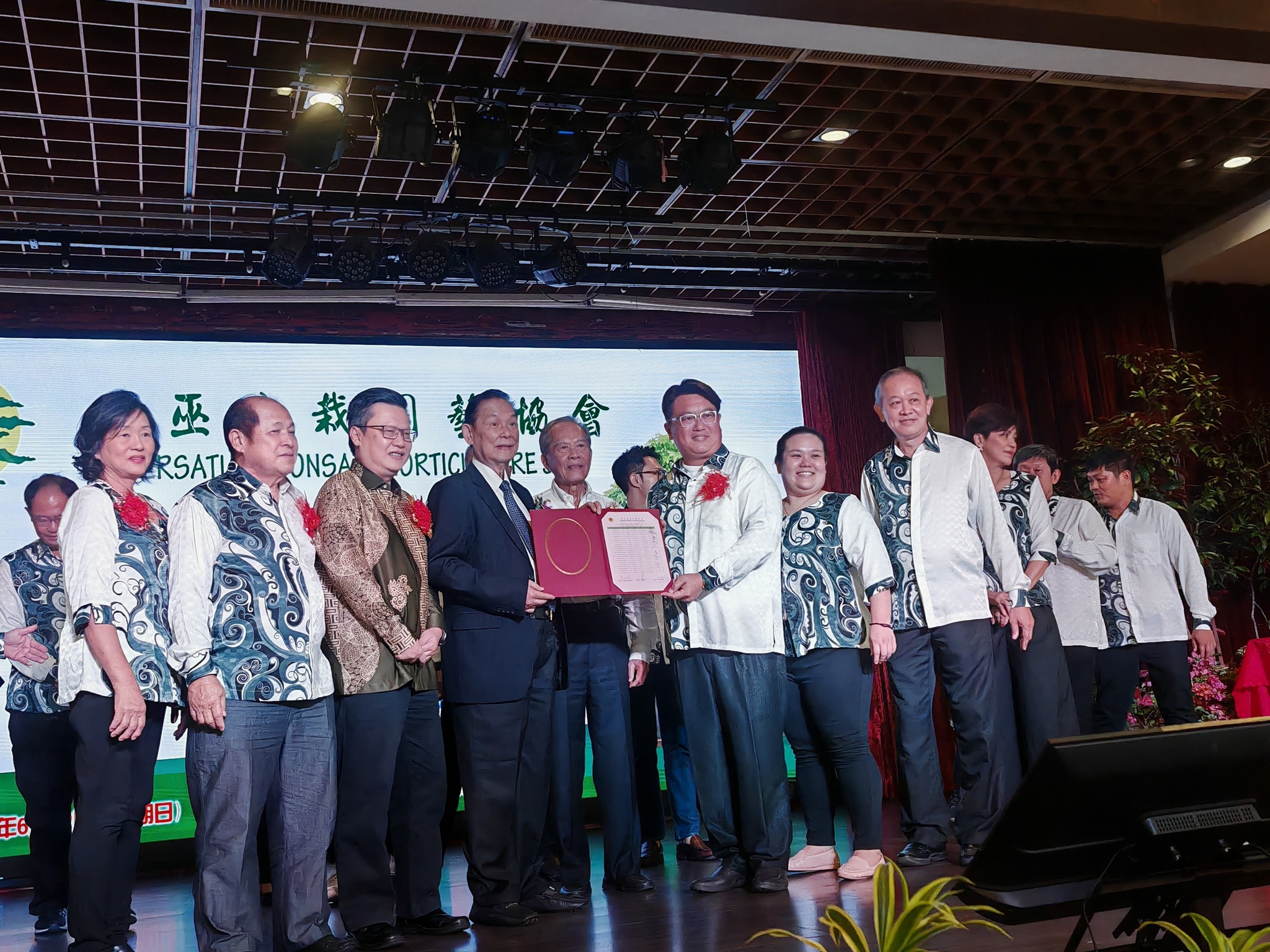 张仕国(前排左四)移交宣誓书予诗巫盆栽园艺协会会长应长龙