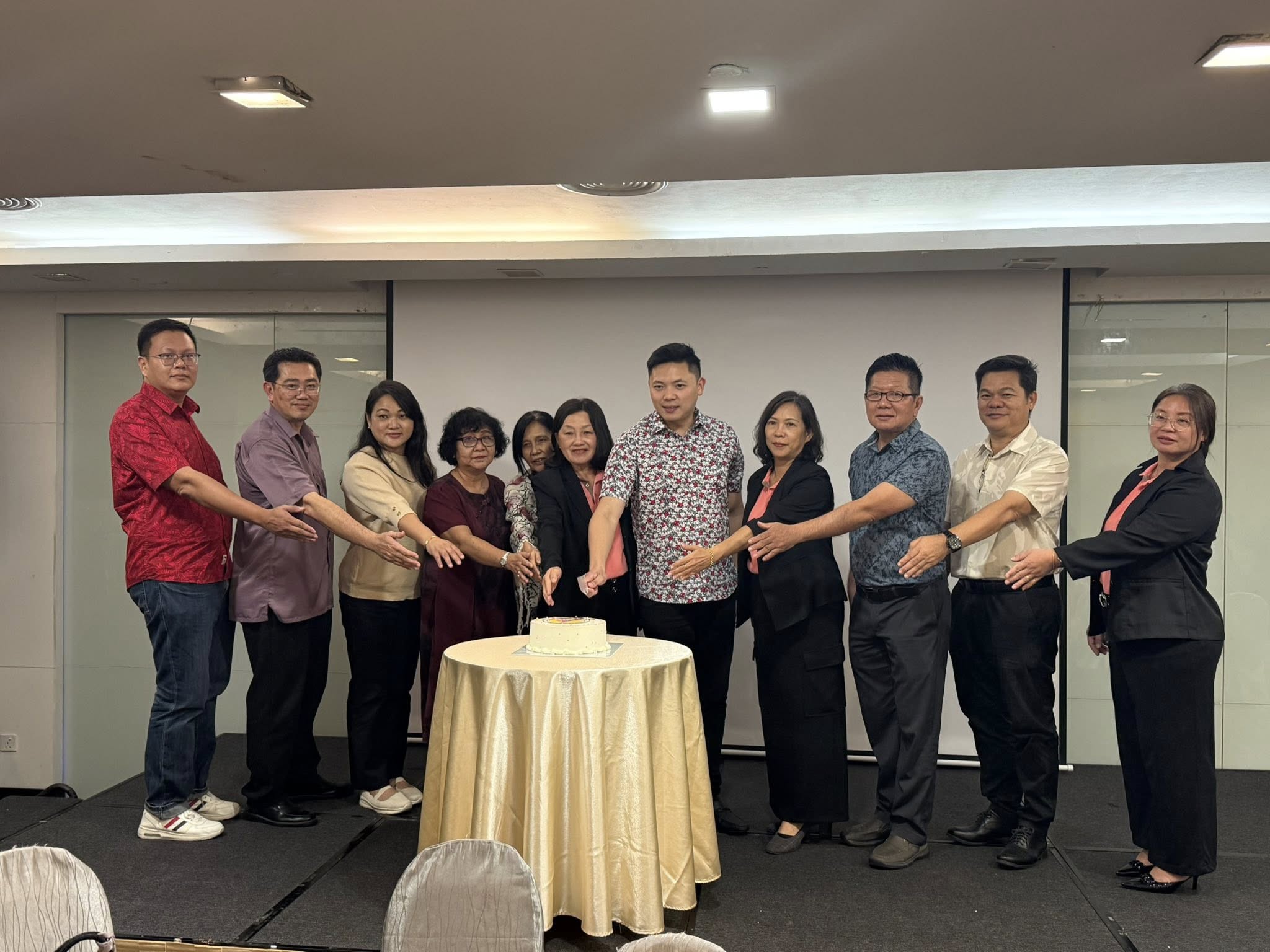 联合切教师节蛋糕。左起砂教师职工会诗巫分会主席许杰勇、诗巫小学校长理事会主席许杰喜、诗巫教育局副局长(学术组)王寿敏、协会顾问雍瑞华、砂拉越师范学院讲师陈秀琼、主席黄巧仙、主宾代表丁福营、筹备会主席许品爱、诗华教师会主席吴耀文、华小董联会主席陈素明、协会副主席翁譓茗。