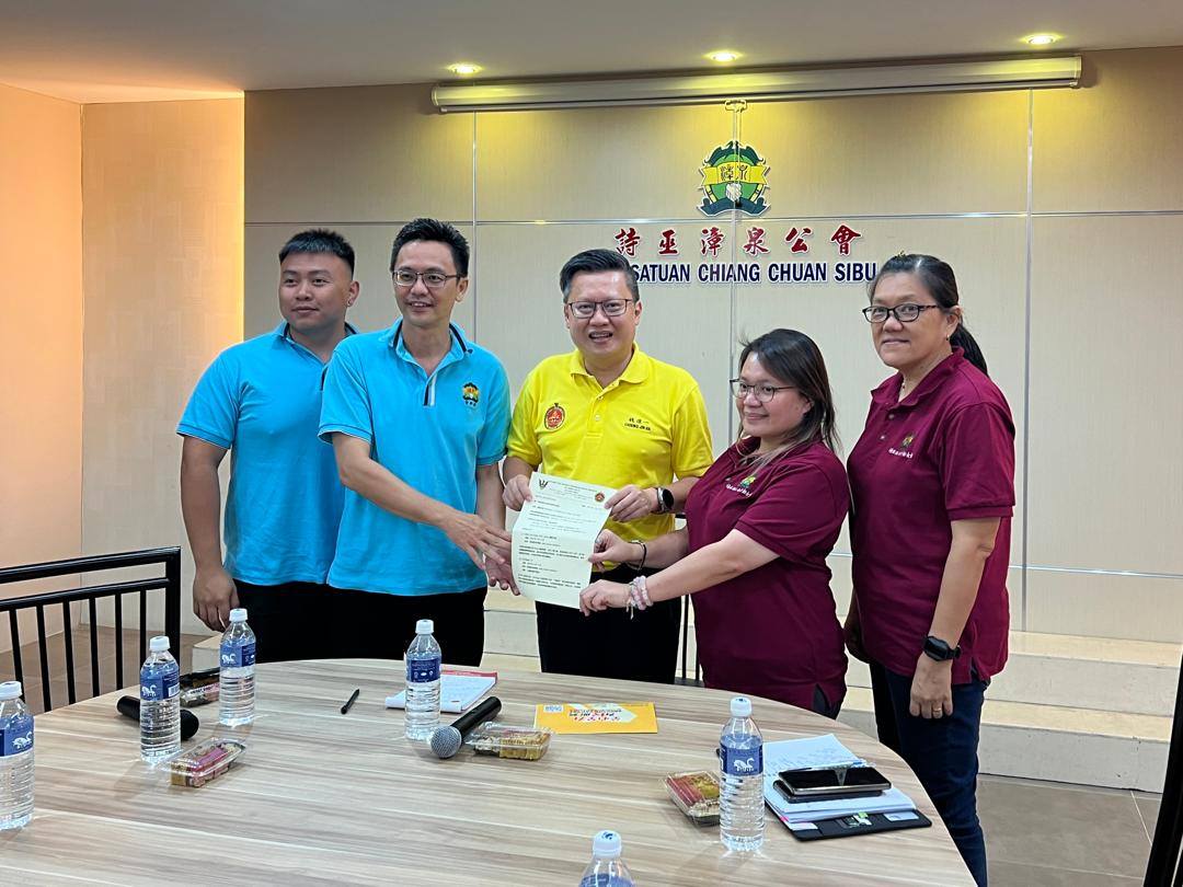 武吉阿瑟区立法议员钱进一(左3)移交《Blast Your Stage 2025》及《The Stage 7.0》两项大型青年舞台活动的邀请函予诗巫漳泉公会青年团团长杜永健(左2)及妇女组主任周顺凤(左4)。