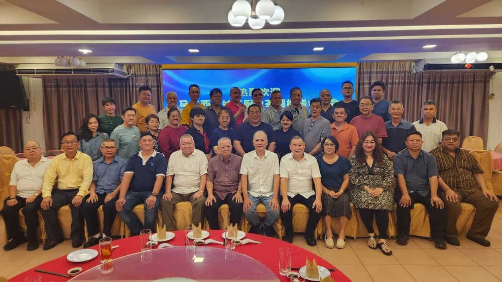 诗巫姑苏厨业餐饮联谊会与总会成员合影。前左7为杨万强总会长、前右3起为诗巫姑苏厨业餐饮联谊会秘书吴玫葶及主席黄世渊伉俪。