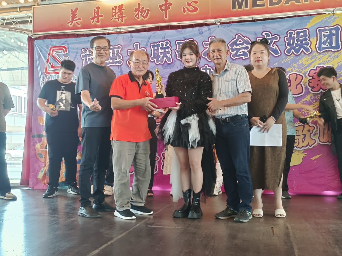 诗巫大联歌友会文娱团主席蔡忠为(右4)颁发冠军奖杯及奖金予范嘉倚。