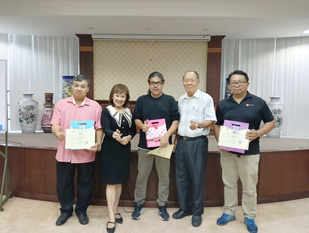 江宗渺(右2)与3名主讲人合影。左起讲师黄志光、活动筹备会主席熊美鹃,讲师张敏及讲师张勇杰。