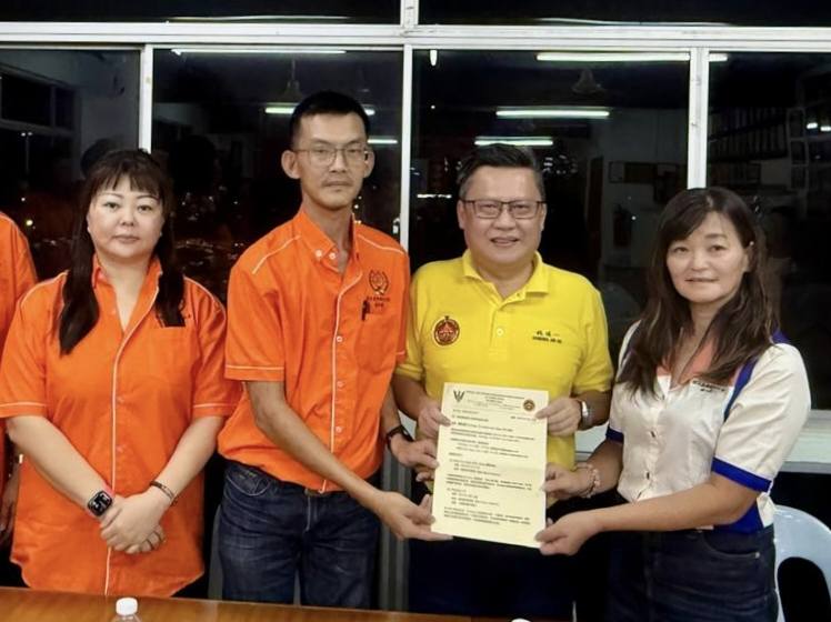 武吉阿瑟区议员钱进一(右二)移交“Blast Your Stage 2025”及“The Stage 7.0”两项大型青年舞台活动邀请函给诗巫荥阳郑氏公会青年团团长郑诗桦(左二)及妇女组主任郑秀妃(右)。