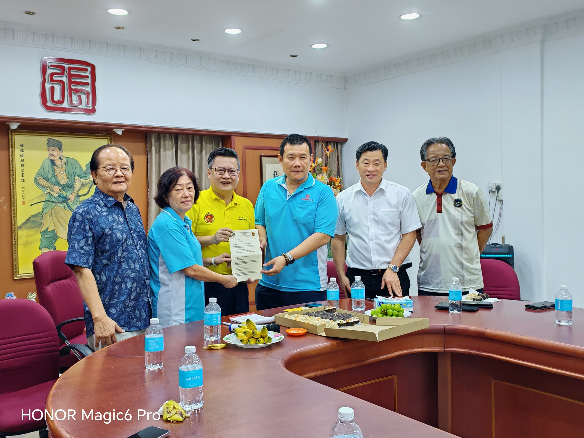 武吉阿瑟区立法议员钱进一(左3)移交 《Blast Your Stage 2025》及《The Stage 7.0》两项大型青年舞台活动的邀请函予砂拉越张氏公会妇女组组长张玉琼(左2)及青年团团长张书菖(左4)。左1为主席张延广及左5为署理主席张永力。