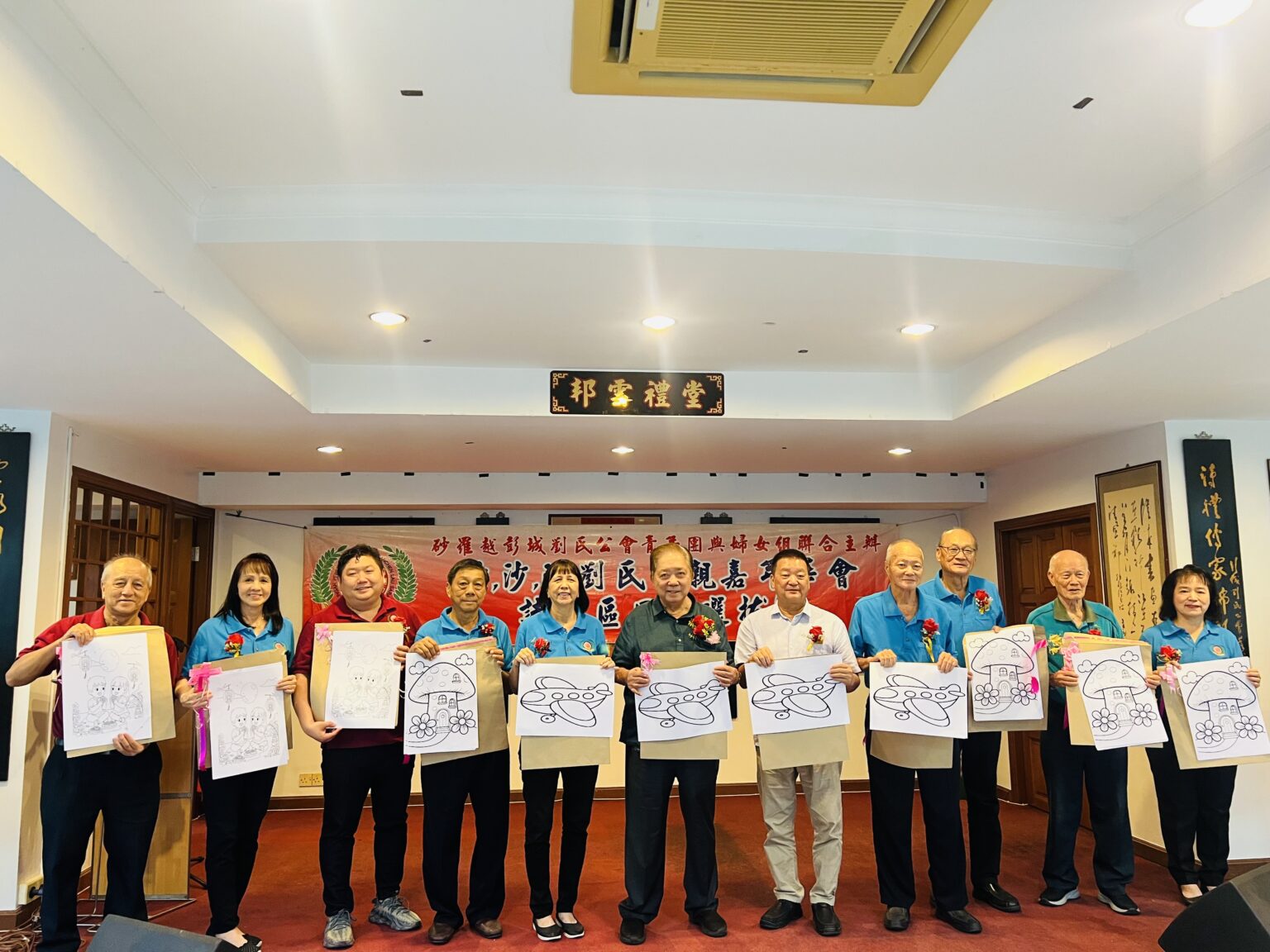 主宾刘本武(中)与主席刘恭福县议员(右5)及筹备会主席刘美琼(左5)为填色比赛主持揭封礼。左起为乐龄组主任刘兴勇、美术组主任刘美真、青年团团长刘健琅、副主席本固鲁刘沟桦、副会长刘人群、副主席刘会贵律师、乐龄组会务顾问刘斌及妇女组主任刘婉美。