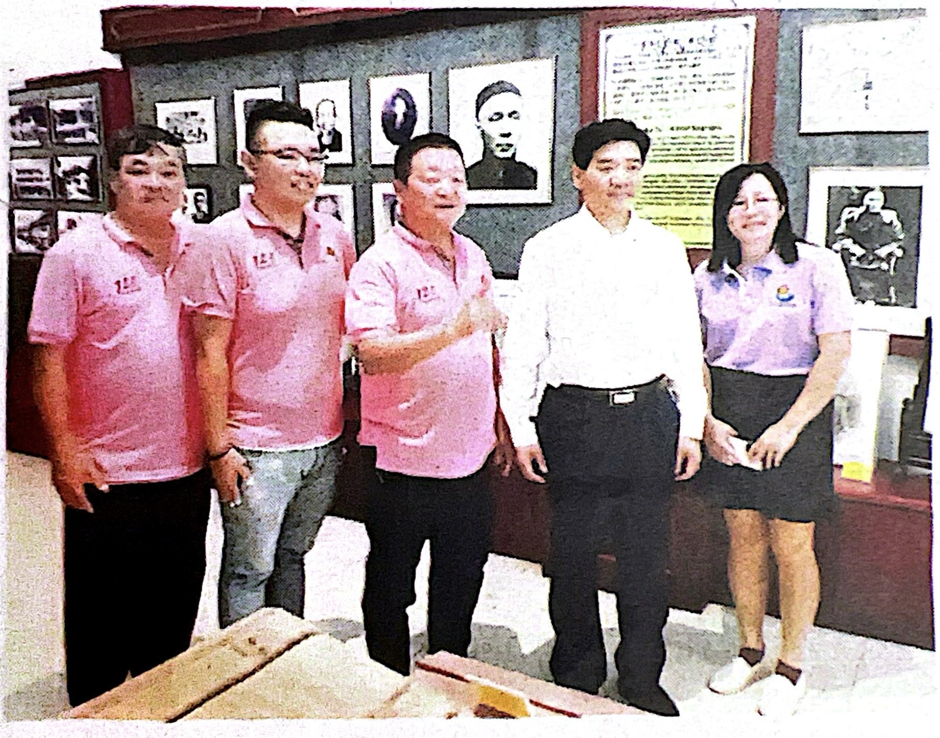 双造合影於文物馆前。前排左3起为福建省侨办海外处副处长裴玉成、刘恭福、福建質人兵政府侨务办公室主任肖华鑫、华团会长严学德、福建省侨办研究者喻摇圻等。