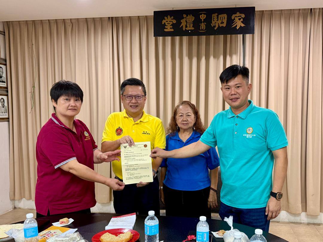 武吉阿瑟区立法议员钱进一(左2)移交《Blast Your Stage 2025》及 《The Stage 7.O》两项大型青年舞台活动的邀请函子砂拉越徐氏公会妇女组组任徐立燕(左)及青年团团长徐传信(选4),并由主席徐链芸(左3)见证。