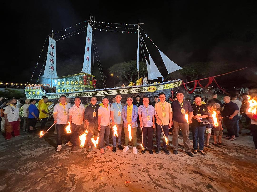 嘉宾们冥船焚烧仪式前合影。前排左3起为杨善、凤凰山二霸王公庙主席陈资元、名誉主席高孔捷、拿督程明智、钱进一、张明豹、永久名誉顾问林恒平、拿汀斯里余养美。