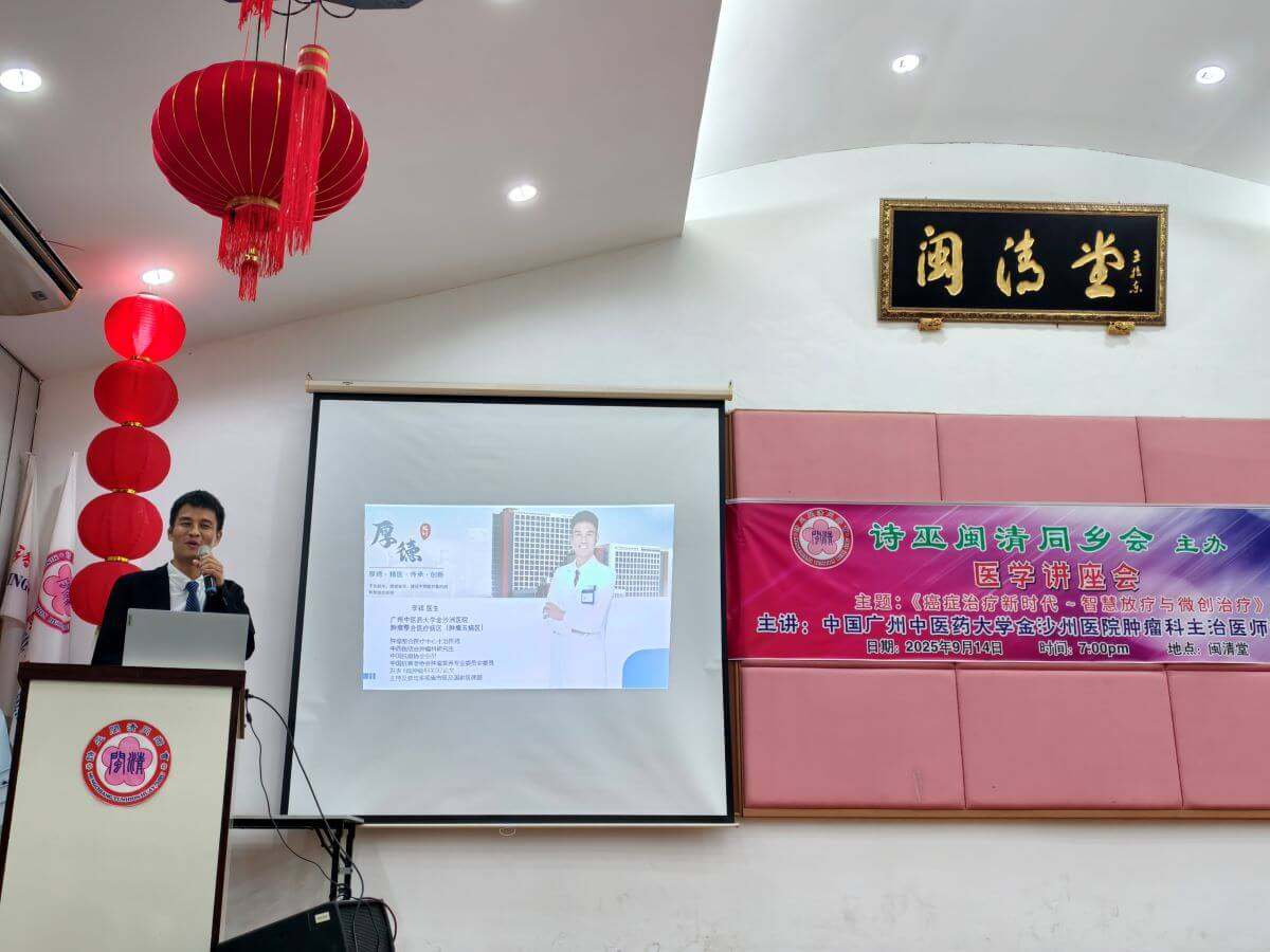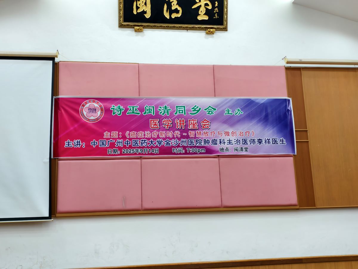 诗巫闽清同乡会於2025年9月14日(星期日)晚上7时正,在该会会所4楼礼堂举办一项医学讲座会,邀请中国广州中医药大学金沙洲医院肿瘤科主治医师李祥医生主讲:癌症治疗新时代一智慧放疗与微创治疗。