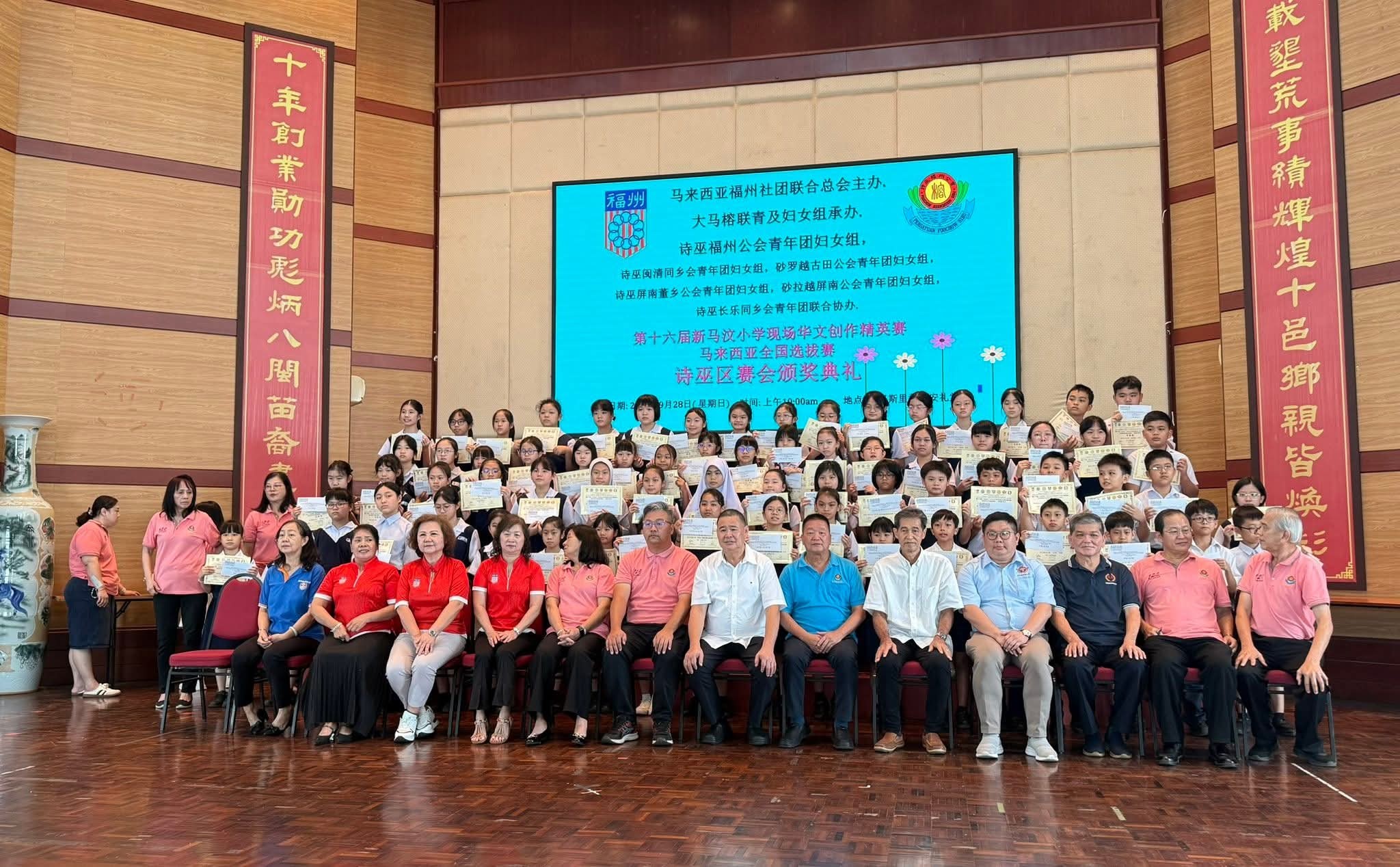 诗巫福州公会于9月28日(星期日)上午,在拿督斯里黄双安礼堂举行两项重要活动“2025年度会员子女 奖助贷学基金颁发典礼”及“第十六届新马汶小学现场华文创作比赛诗巫区赛会颁奖典礼”。