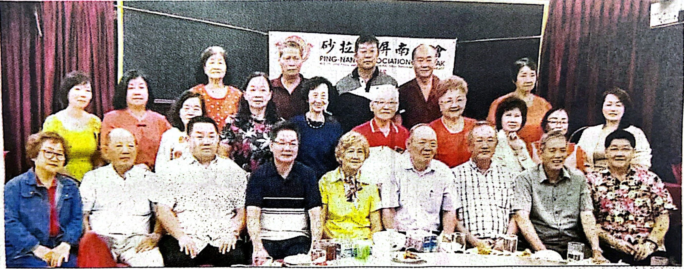 砂拉越屏南公会公会领导、顾问与出席合影。左起为顾问黄爱娇、顾问黄海城,青年团长杨仁福,秘书长林廷界、松龄组主任包素然、顾问江宗渺、副会长陈家维及顾问林志强。