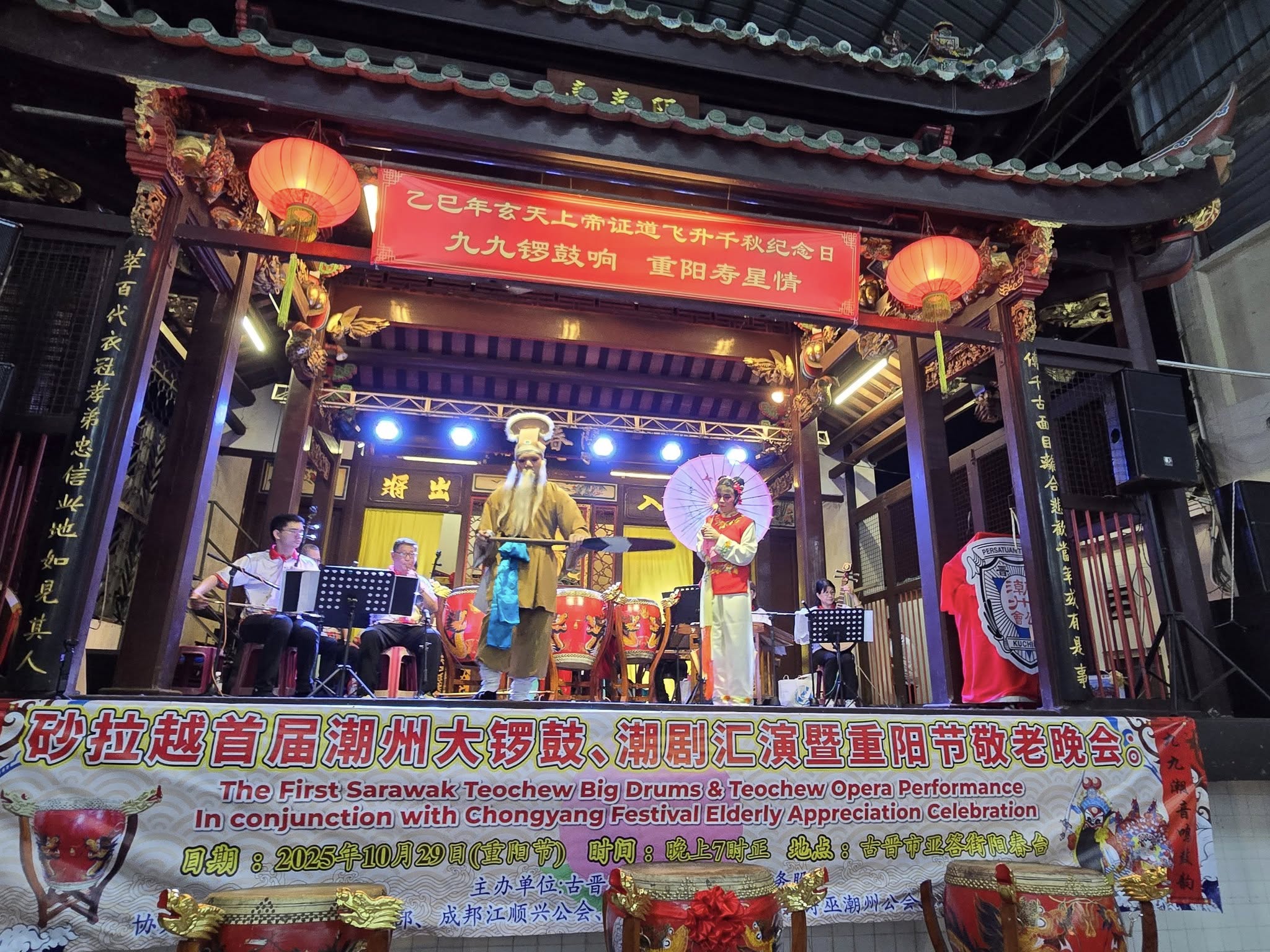 诗巫潮州公会为了弘扬潮州传统大锣鼓文化,及促进砂邦潮州同乡之间的情谊与鼓艺交流,日前在该会主席甲必丹舒玉麒率领下,一团21名队员远赴古晋,参加由古晋潮州公会玄天上帝庙保管委员会与文化股携手联办的「重阳节敬老暨首届全砂潮州传统大锣鼓与潮剧汇演晚会」。