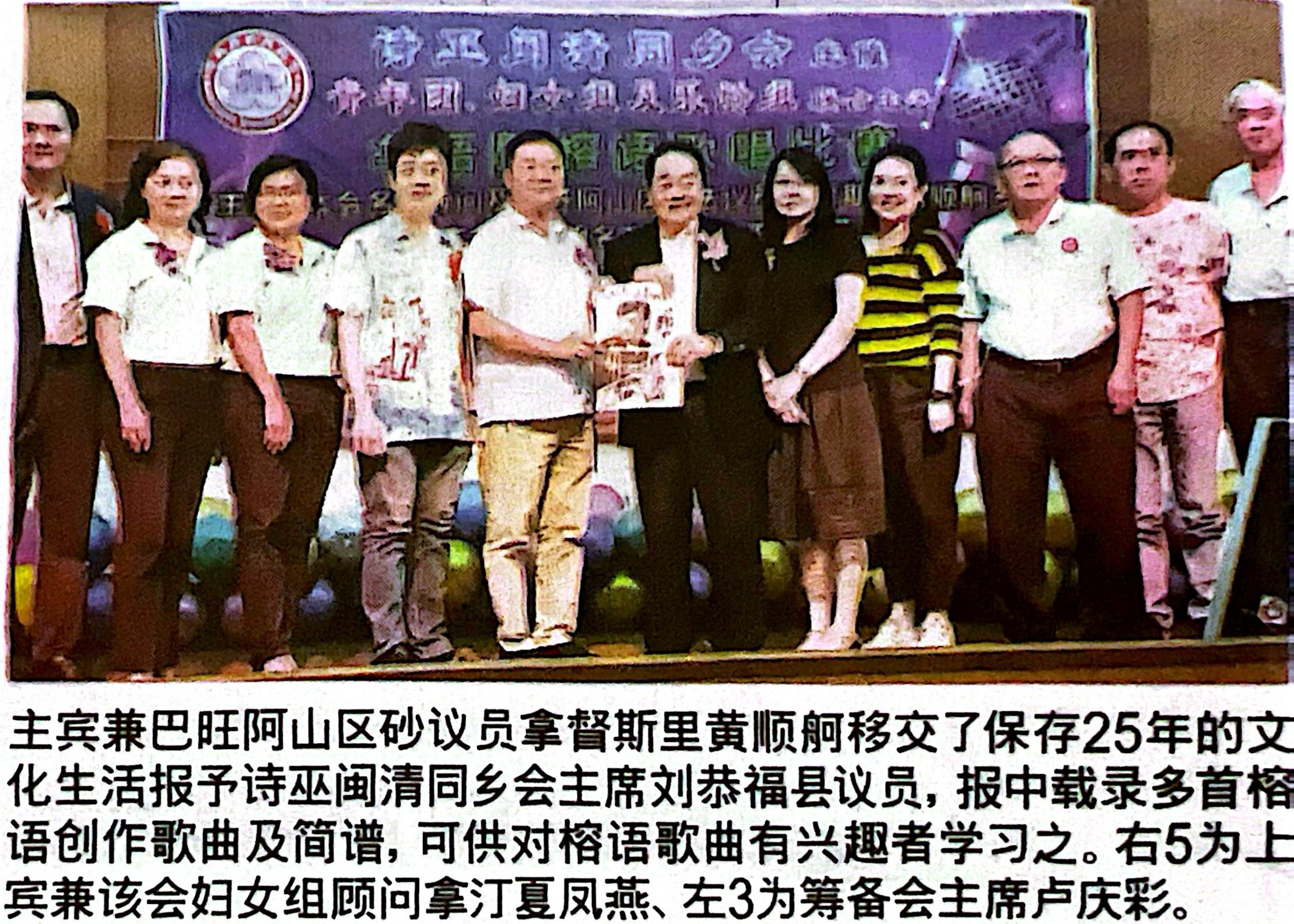 拿督斯里黄顺舸也因此带来他已珍藏25年的《文化生活报》,因该刊物收录多首福州创作歌曲及其简谱。他在歌唱赛开幕礼上,移交予闽清同乡会,期待由该会推广相关原创福州歌。