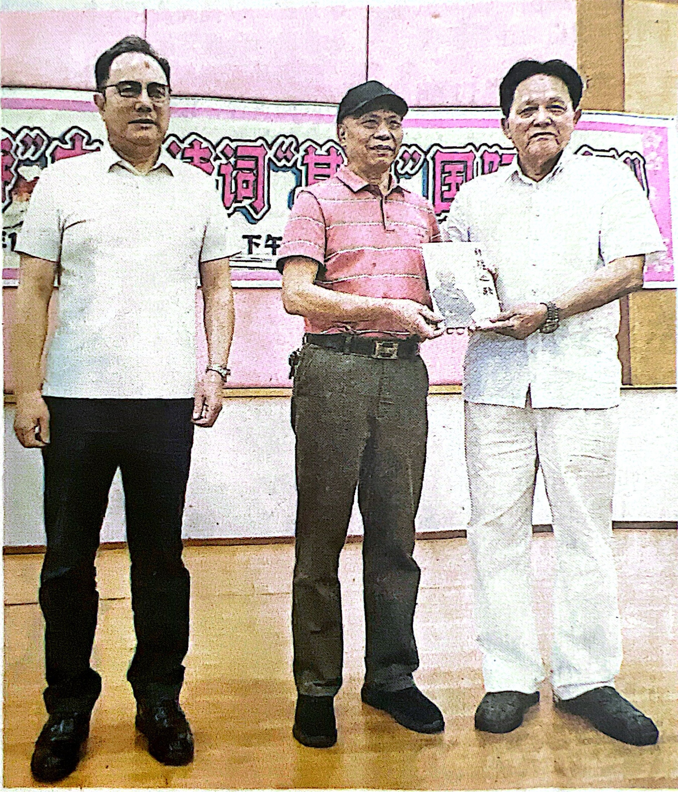 闽清县政协梅声诗社副社长兼吴孟超精神学习宣传研究会秘书长张德团(中)赠送缅怀吴孟超院士诗词专辑《肝胆之歌》给诗巫诗潮吟社,由黄政仁领取。