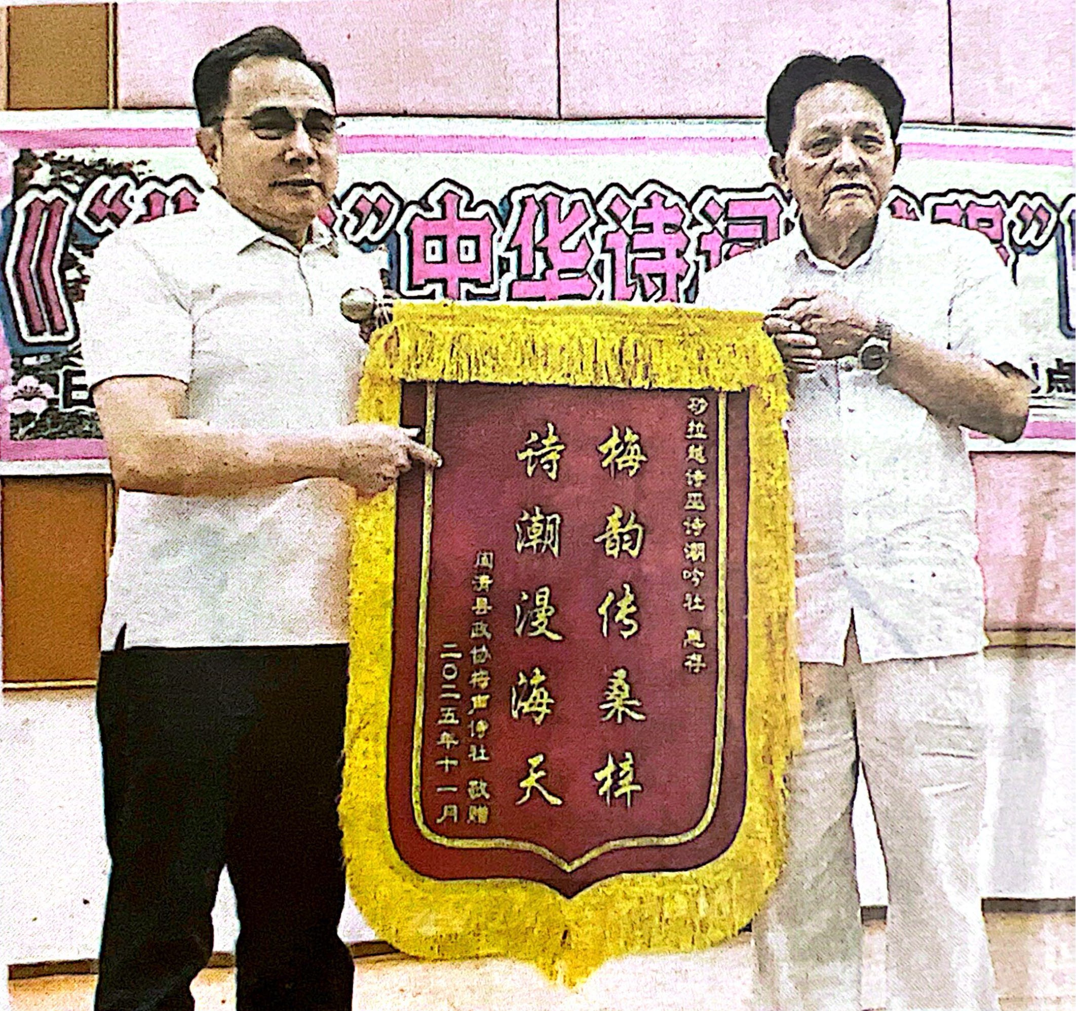 闽清县政协梅声诗社社长黄维江(左)赠送锦旗给诗巫诗潮吟社,由社长黄政仁领取