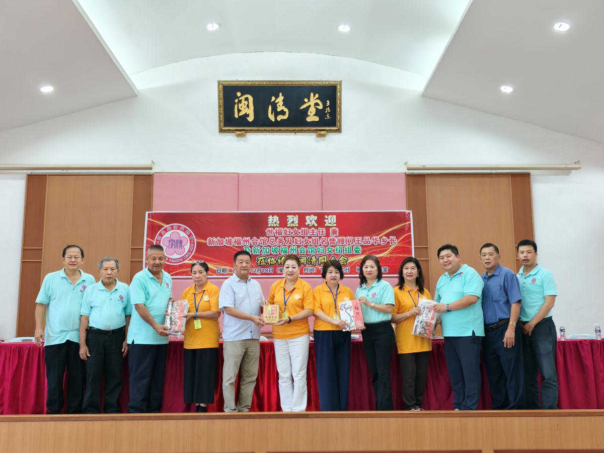刘恭福赠送纪念品予新加坡福州会馆总务及妇女组名誉顾问兼世福妇女组主任王品华,左起为诗巫闽清同乡会秘书刘宜福、乐龄组主任刘恭轩、青年团团长刘健琅、副主席刘会福、妇女组主任陈俏颖、新加坡福州会馆妇女组主任黄赛芳等。