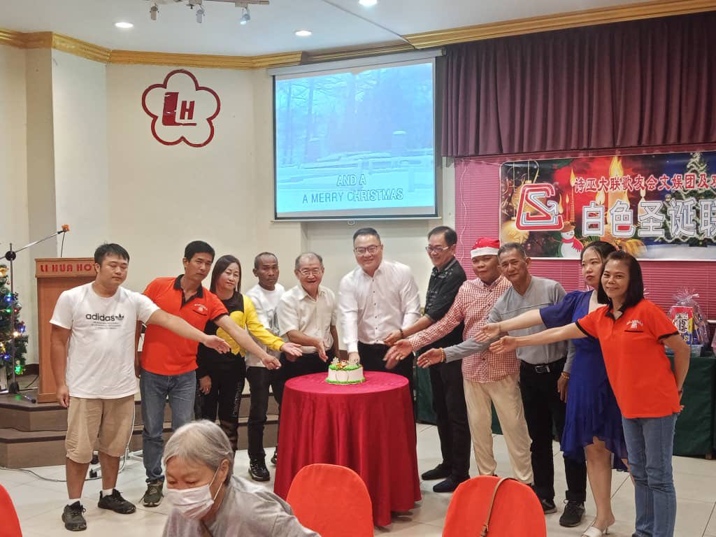 众人合切圣诞节蛋糕;左五及左六分别是诗巫大联歌友会主席蔡忠为及名誉顾问刘强燕的代表周俊毅。